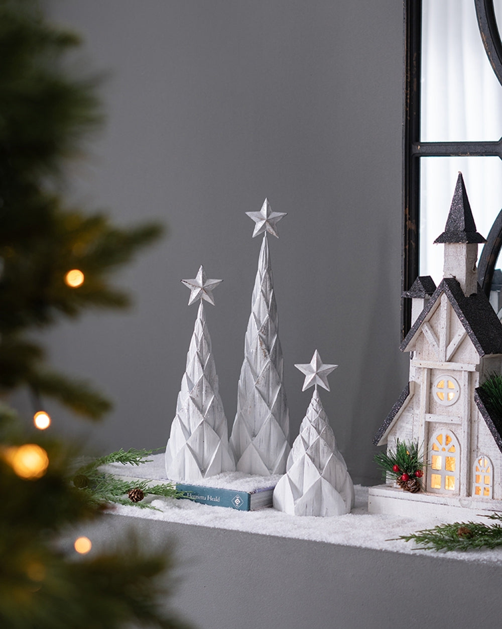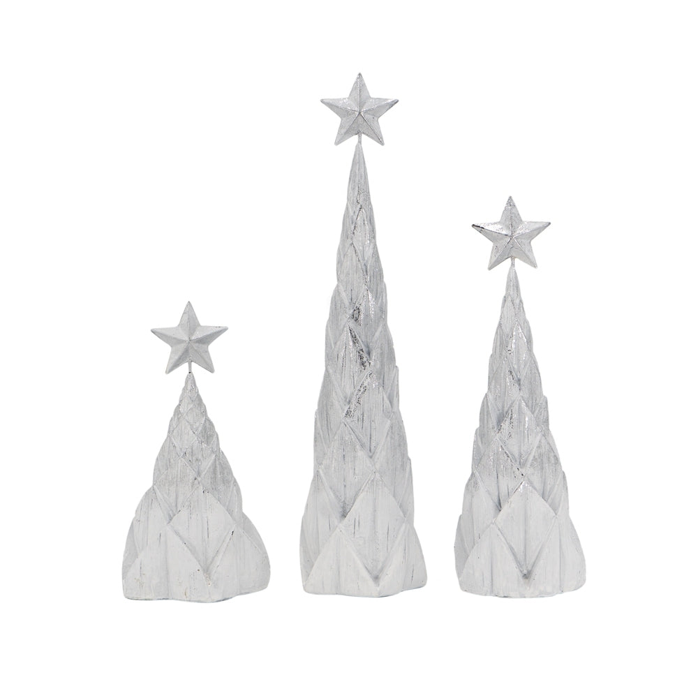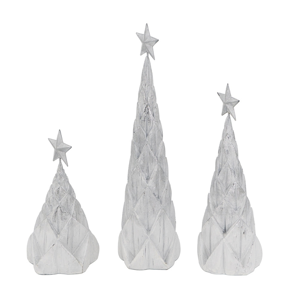 - Gorgeous examples of modern winter decor, the three white trees in this set have a gleaming silver foil finish and festive star toppers