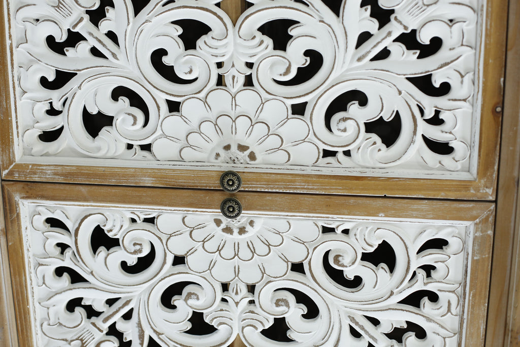 - 4 Hollow-carved Door Cabinet - This vintage chic cabinet features with 4 carved door for eye-catching and distinctive character, goes with any shabby chic or vintage style. An antique style, functional design and elegant attention to detail make this cabinet a fine addition to many style home decors
