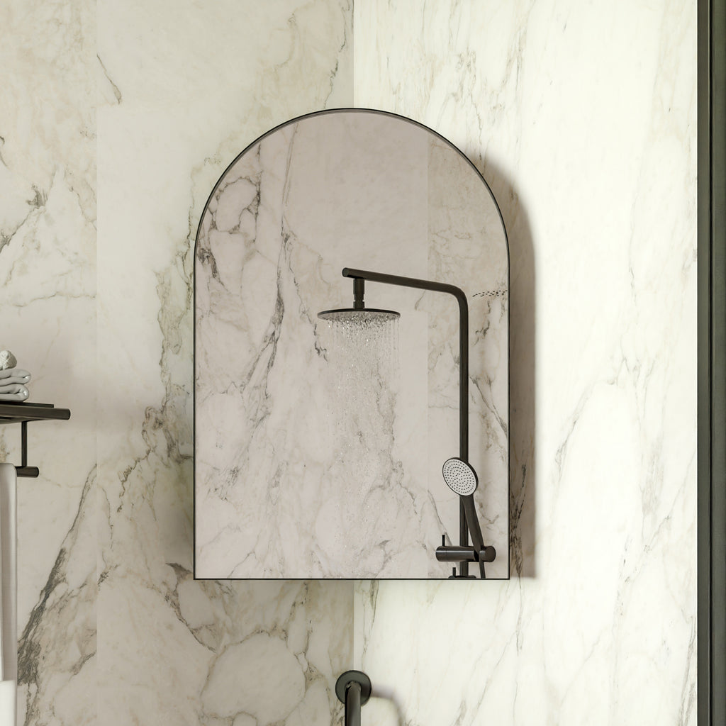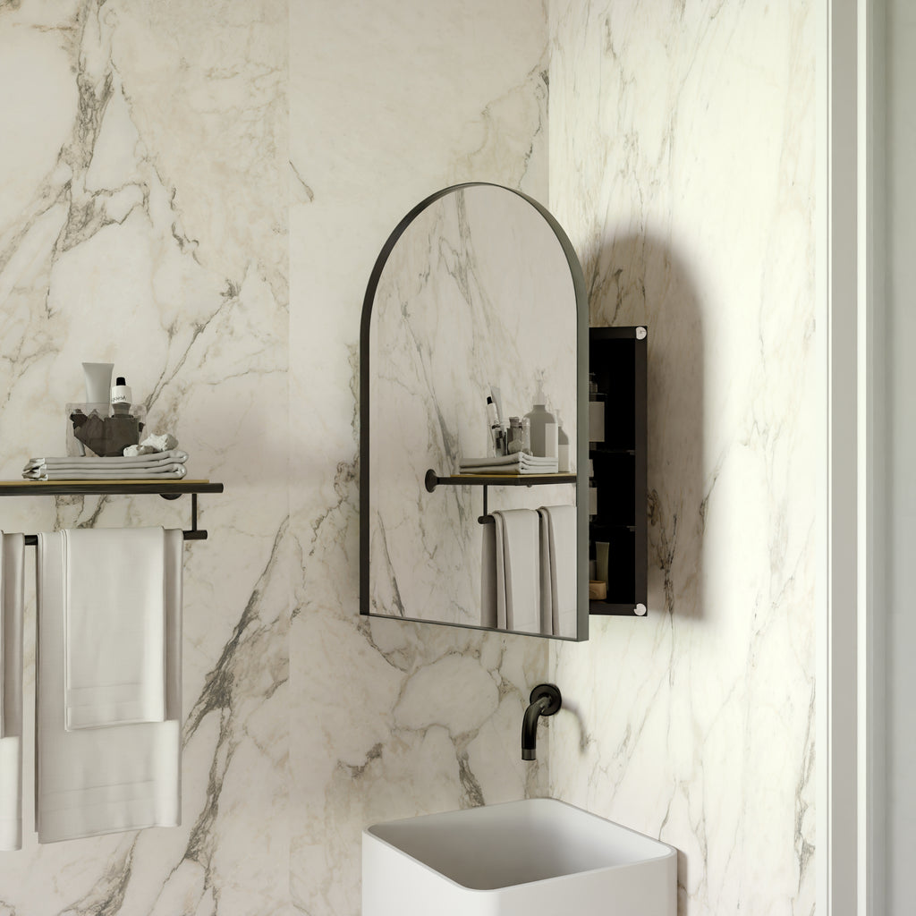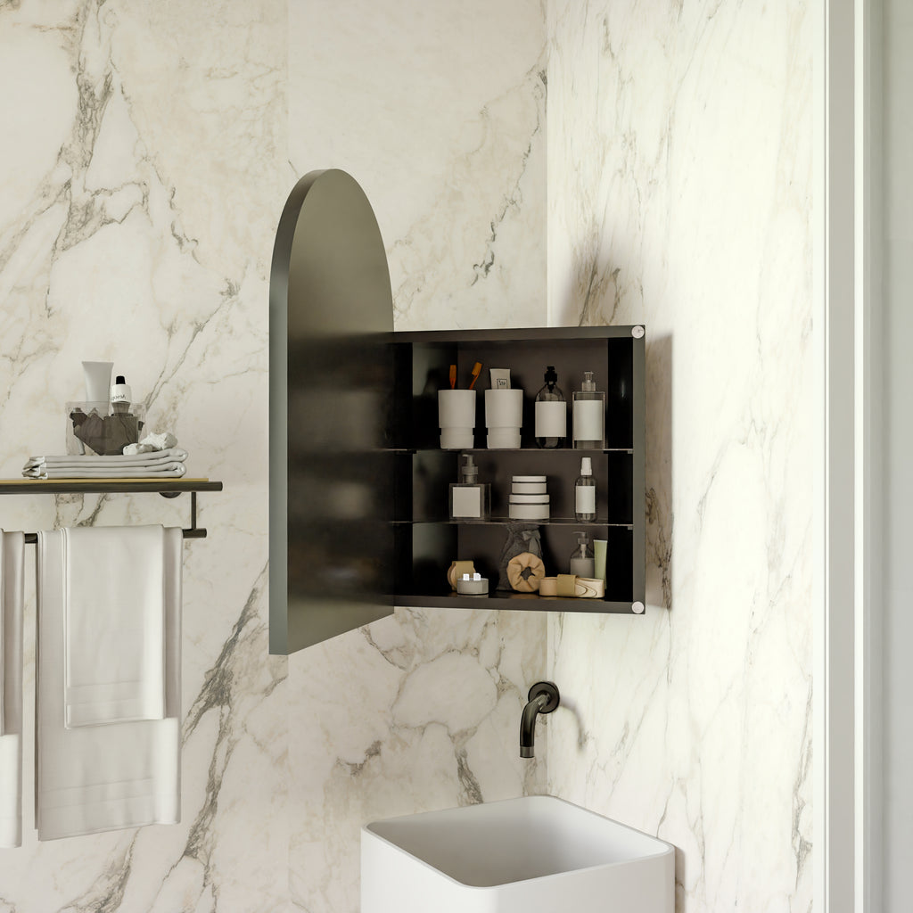 • Elegant Arched Glass Mirror Door: Features a stylish arched mirror door that not only offers a clear reflection for grooming but also adds a touch of sophistication to your bathroom decor.