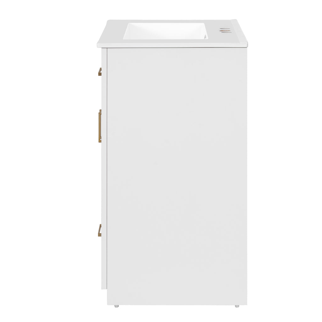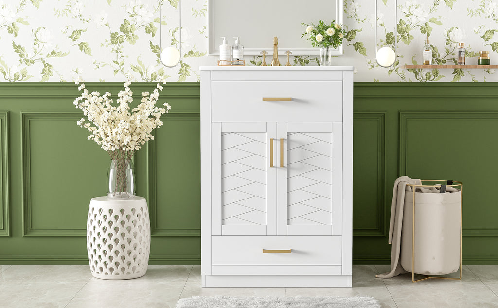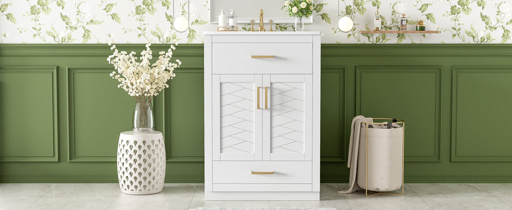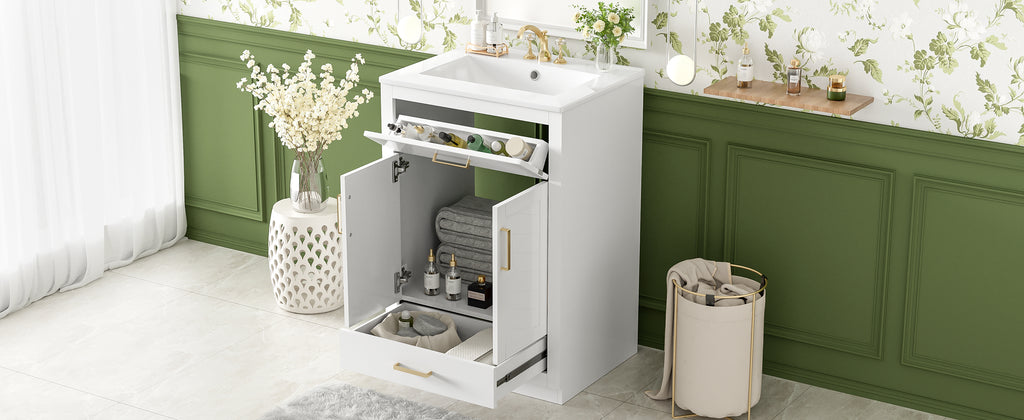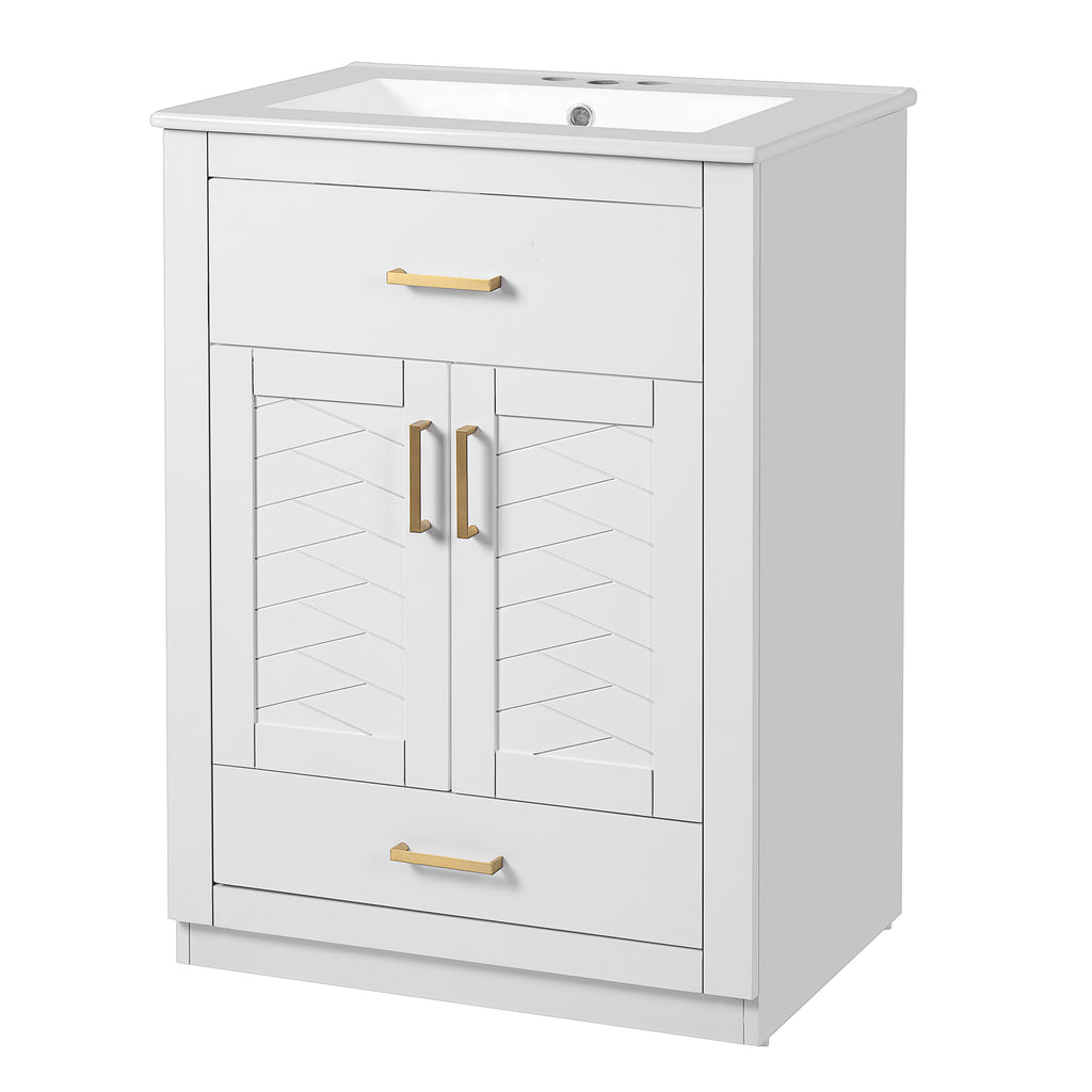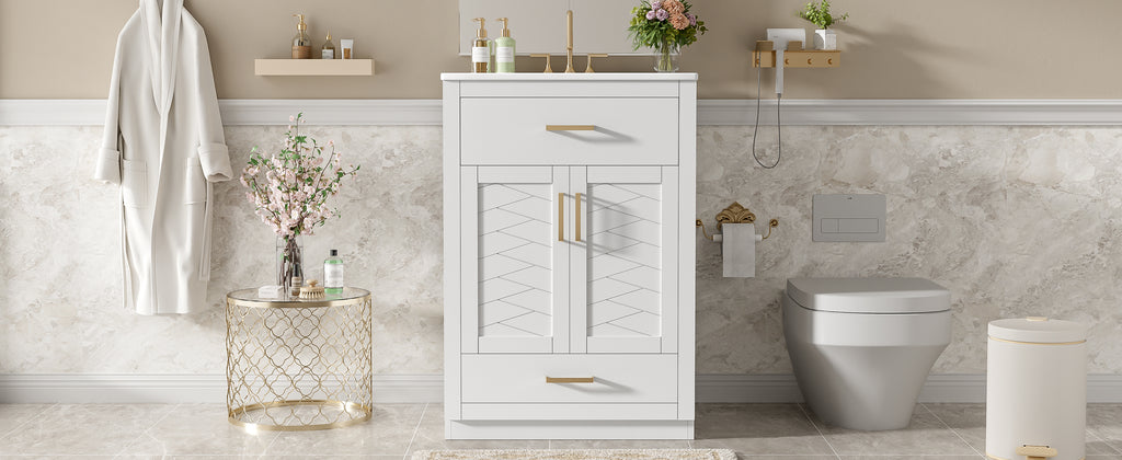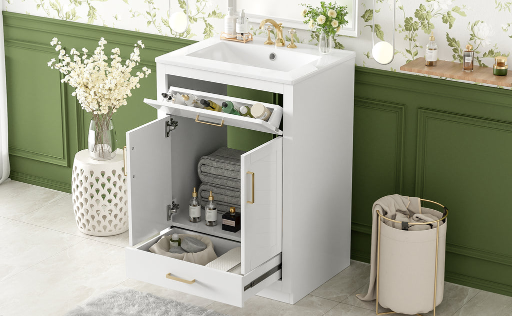 This elegant bathroom vanity combines smart functionality with timeless design. It features a spacious storage cabinet with a tip-out drawer,a full extension drawer and vintage-style hardware for flexible organization. The graceful sink basin offers both visual appeal and practicality, designed to fit standard 4-inch faucets (not included) with convenient pre-drilled plumbing access. Easy to assemble with clearly labeled components and included hardware, this compact vanity delivers both style and convenience, making it perfect for small spaces while complementing various bathroom décors.