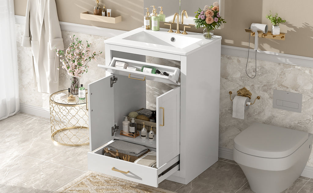 - 【Spacious & Customizable Storage】This vanity provides ample storage to keep your bathroom essentials perfectly organized. It features double-door cabinet, flip-out drawer, and full-extension drawer, maximizing every inch of space. The spacious door cabinets offer quick access to daily items, helping you maintain a tidy and efficient environment with ease.