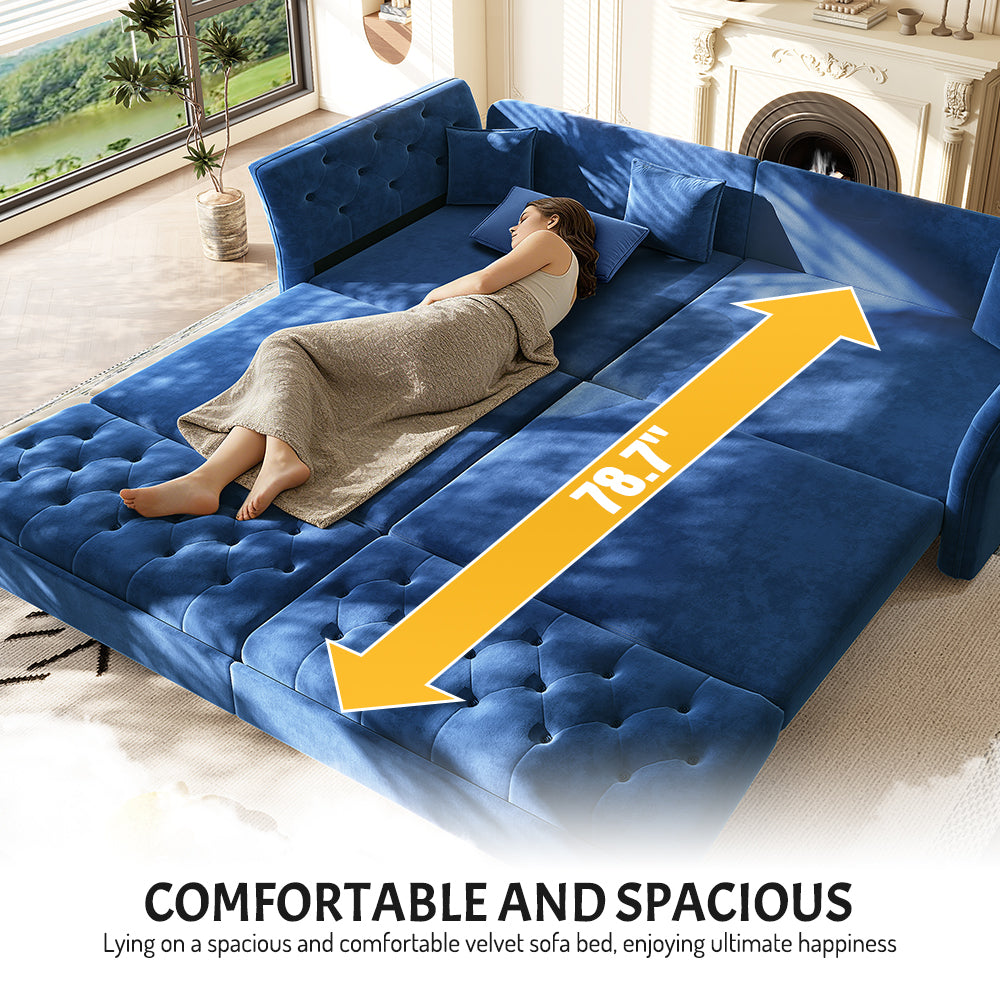 100' Oversize Pull Out Sofa Bed, Convertible Sleeper Sofa with Handmade Fabric Flower Tufted Design,Multi-Functional Velvet Loveseat Bed for Living Room,Bedroom,Apartment,Blue