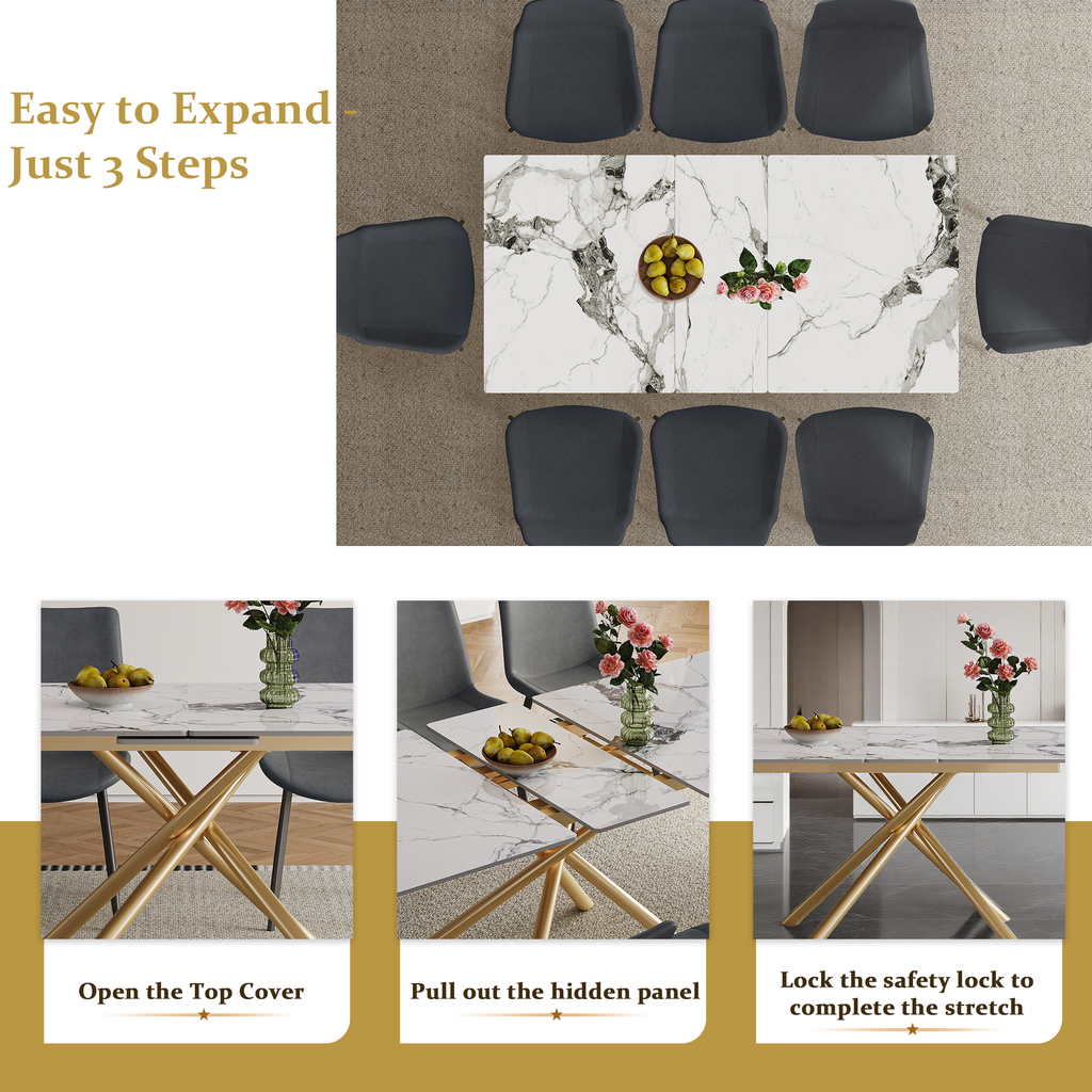Modern 59-inch Expandable Dining Table with Retractable Leaf, Charred Stone Top & Golden Carbon Steel X-Base, 4-6 Person Set with 4 Gray PU Chairs for Small Apartments, Kitchen