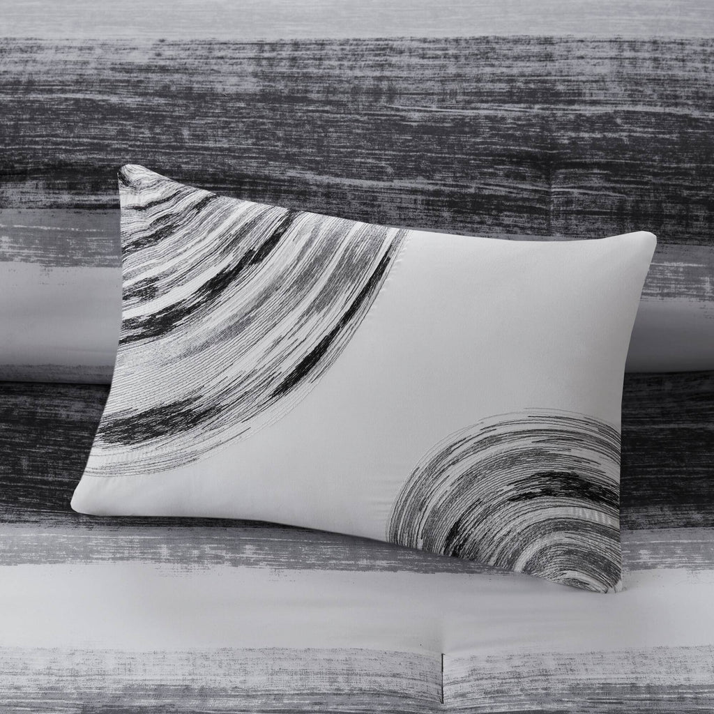 • The matching shams (1 in Twin Sizes) mirror the pattern of the comforter, while an embroidered decorative pillow and a solid grey bed skirt to complete the bedding set.
