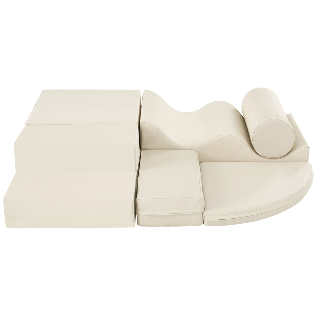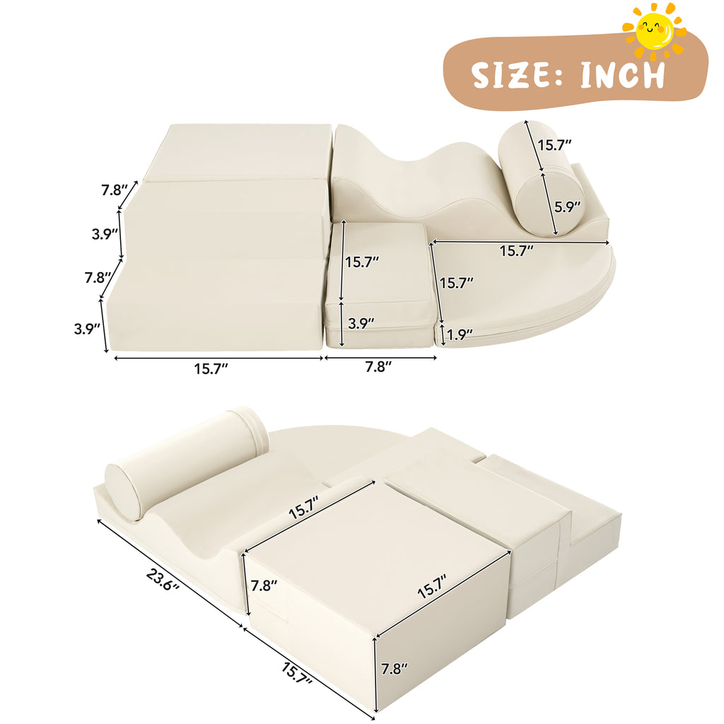 • This crawling toy set consists of a staircase, a square mat, a rectangular mat, a fan-shaped mat, a wavy climbing mat, and a cylinder.