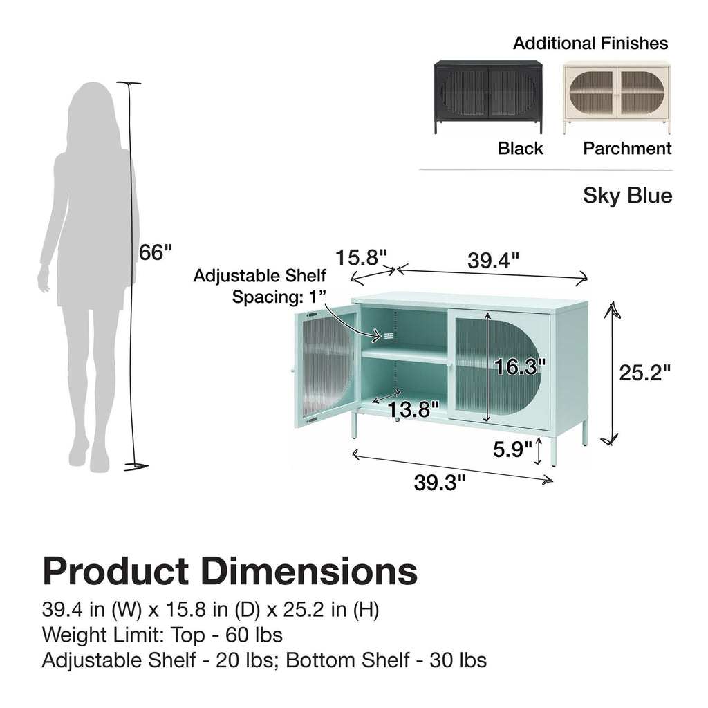 In need of a seriously cute accent cabinet to both modernize and organize your space? The Luna Cabinet is the perfect combination of storage with an elevated design that can solve your organization and style needs in one piece! The resilient metal construction really delivers in terms of versatility while the oval-shaped fluted glass doors add a distinguished charm to this dashing decorative cabinet. The Wide 2-Door Accent Cabinet provides two roomy shelves (one adjustable) so you can instantly streamline and organize your living space in a flash. Add style and much-needed storage to your living room, kitchen, den, bathroom, guest room, or really any room in the home! Perfect for your aesthetic: Minimal, Vintage-Eclectic, Boho.