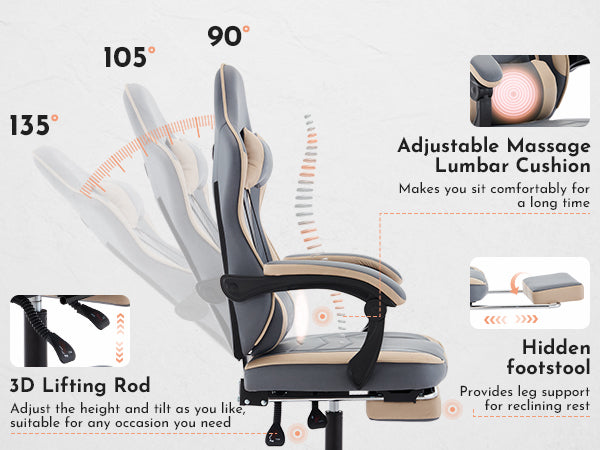 • Versatile And Adjustable: The gaming chair includes an adjustable headrest, a seat height adjustment range of up to 4 inches, and retractable foot supports to meet the needs of users of different heights. The back of the chair can be adjusted to 90°, 105°, and 135°, so you can find the ideal Angle for work, play, or relaxation. The chair also has silent wheels to make the movement smoother and quieter for the best comfort experience