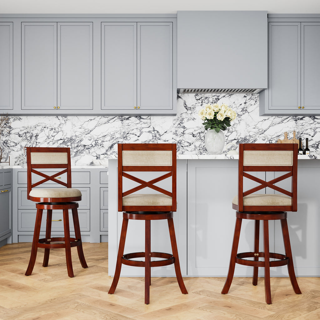 30' Bar Height X-Back Swivel Stool, Stool, Cherry, Beige Fabric