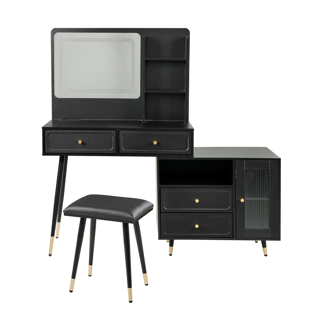 Included with the vanity desk is a ergonomic stool. its solid woodlegs, soft seat with PU cover and inserted 1.6' foam pad ensureoptimal comfort during daily makeup routine.