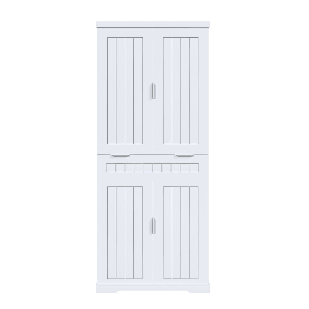 Farmhouse Style White Pantry Cabinet with Drawer, 2 Cabinets & 6 Door Shelves, Adjustable Shelves, Freestanding Cupboard