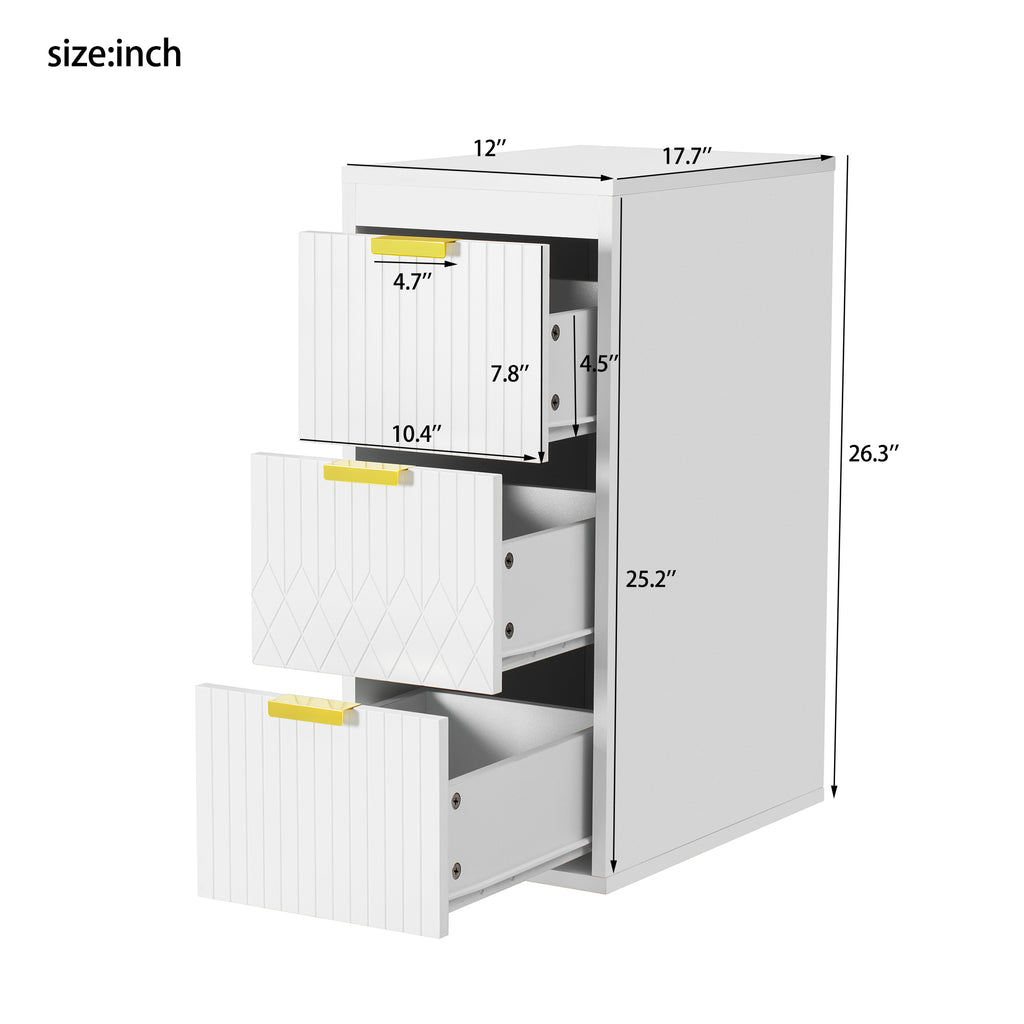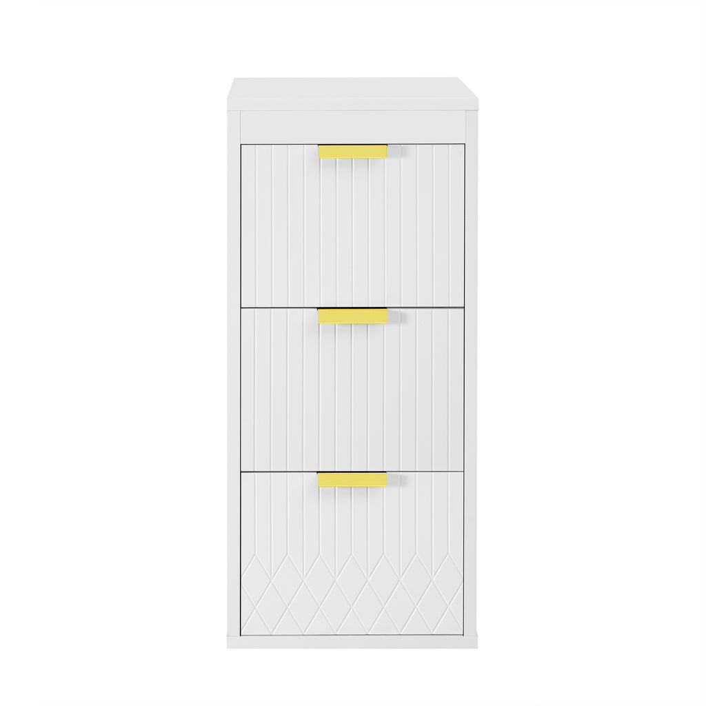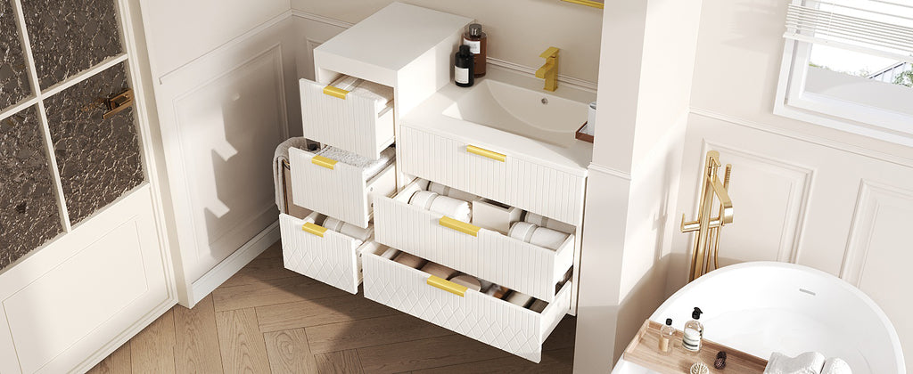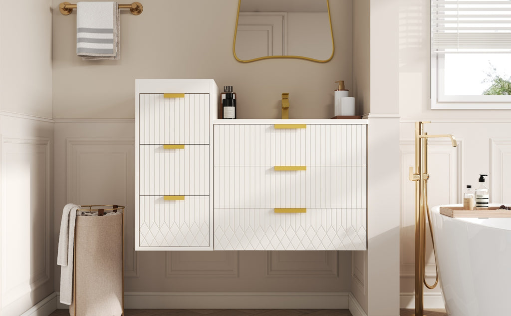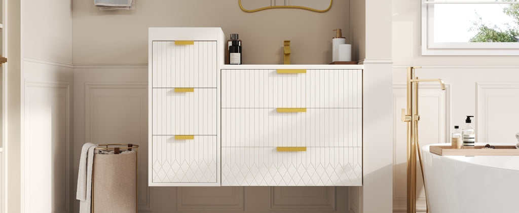 - [Elegance in the Details] Beyond mere functionality, this cabinet showcases a commitment to refined aesthetics. The sleek L-Shape handles are crafted from solid metal, offering a satisfying tactile feel and lasting durability. A subtle stripe carving is elegantly etched across the surfaces, introducing a whisper of texture that catches the light beautifully. This minimalist detail elevates the entire piece, transforming it from a simple storage unit into a deliberate element of your bathroom.