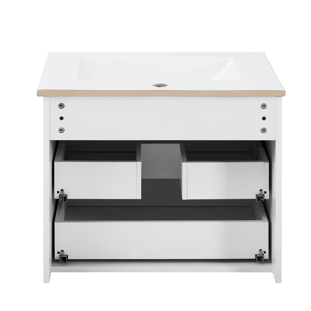 - [A Foundation of Quality and Style] This bathroom cabinet is built upon a foundation of premium materials and thoughtful design. At its heart is a high-quality ceramic basin sink, chosen for its durable, non-porous surface that is exceptionally easy to clean and maintain. The sink is thoughtfully equipped with an anti-spill hole to effectively manage overflow, adding a layer of practical convenience to your daily routine.