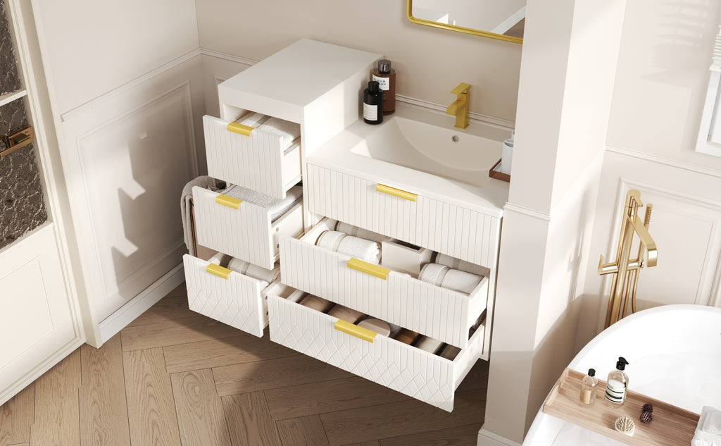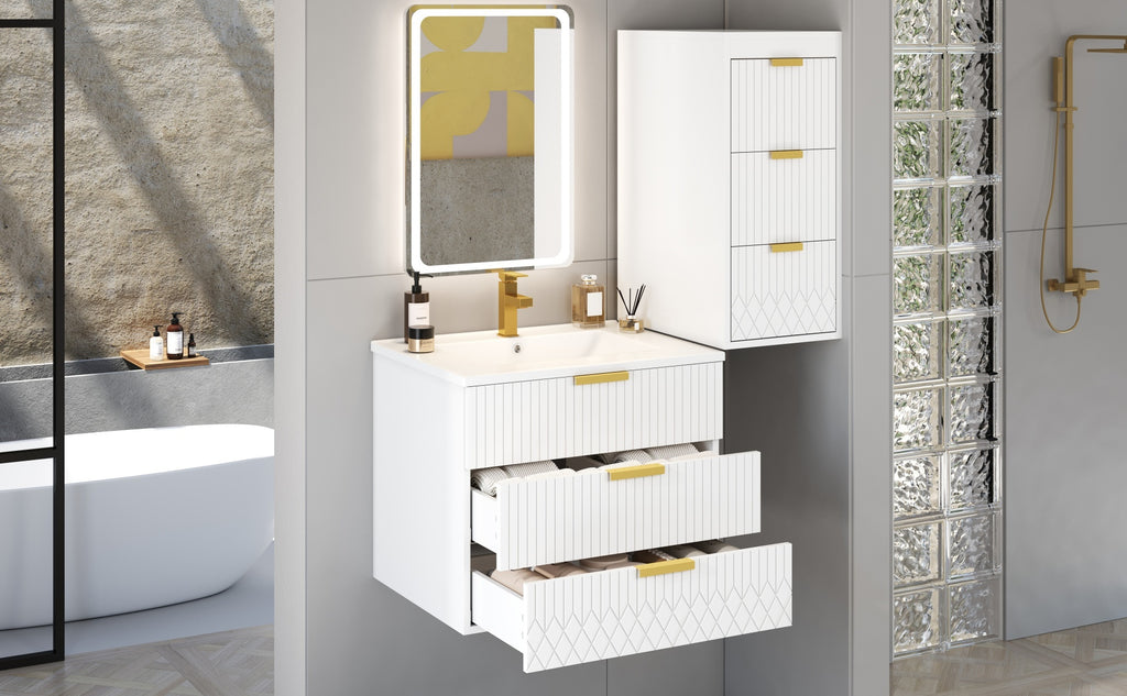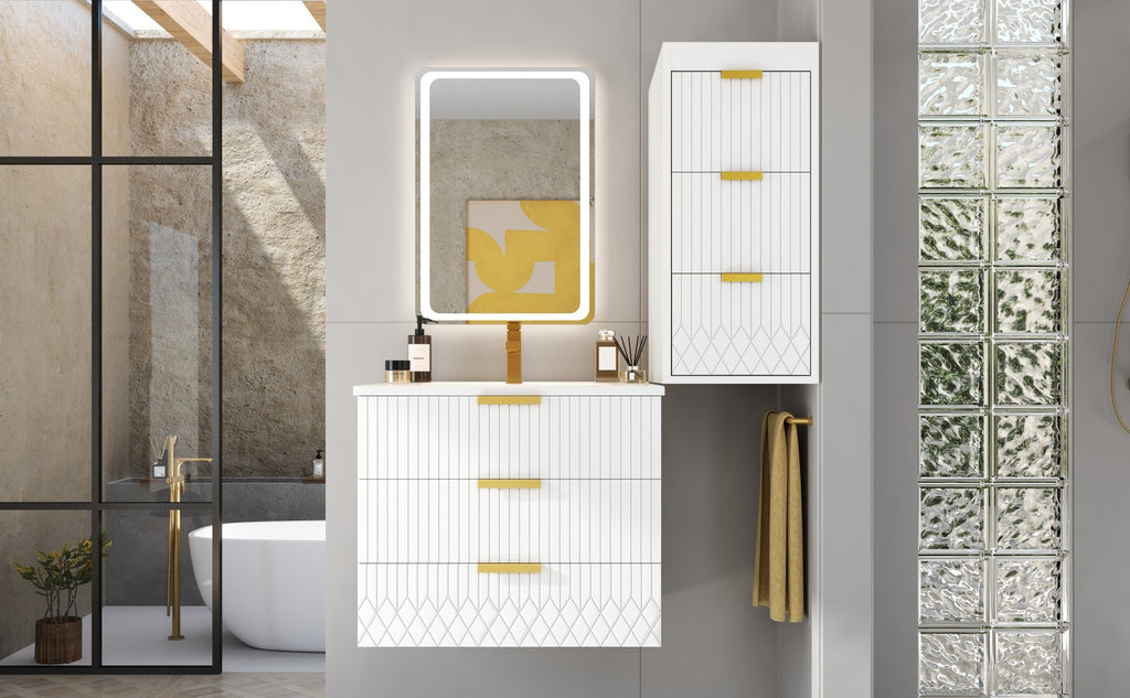 Experience the perfect fusion of premium design and intelligent functionality with this wall-mounted bathroom cabinet. Its core features a durable ceramic basin sink, complete with an anti-spill hole and a standardized faucet fitting, ensuring long-lasting performance. The elegant L-Shape handles and subtle stripe carving elevate the aesthetic, while the spacious interior provides ample room to organize all your essentials. Designed with versatility in mind, the cabinet can be mounted at your preferred height, creating a customized storage solution that maximizes space and simplifies cleaning in any bathroom.