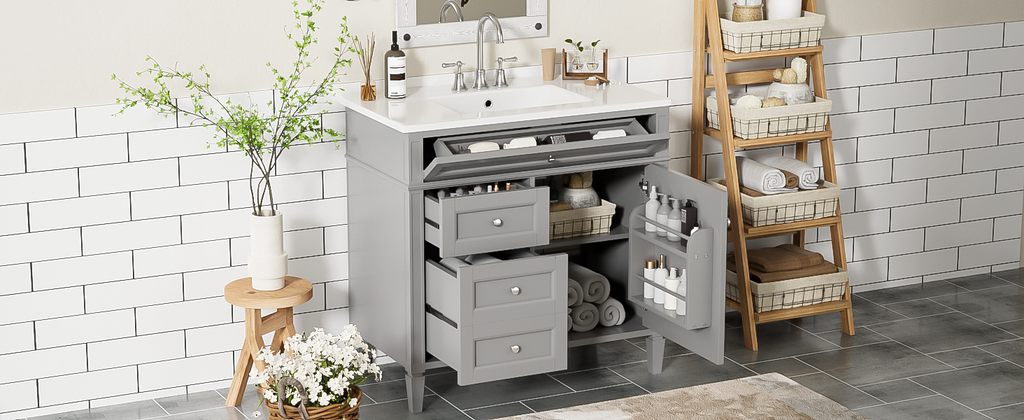 • [ Multi-Purpose Cabinet & Concealed Storage ] Are you looking for stylish and functional storage solutions for your bathroom? Our bathroom vanity provide ample space for all your toiletries and bathroom essentials. The combination of the cabinet body and the drawer perfectly stores all kinds of bathroom products and keeps the necessities away from water stains and dust. Soft-close doors and drawer fronts feature a water-resistant paint finish for durability.