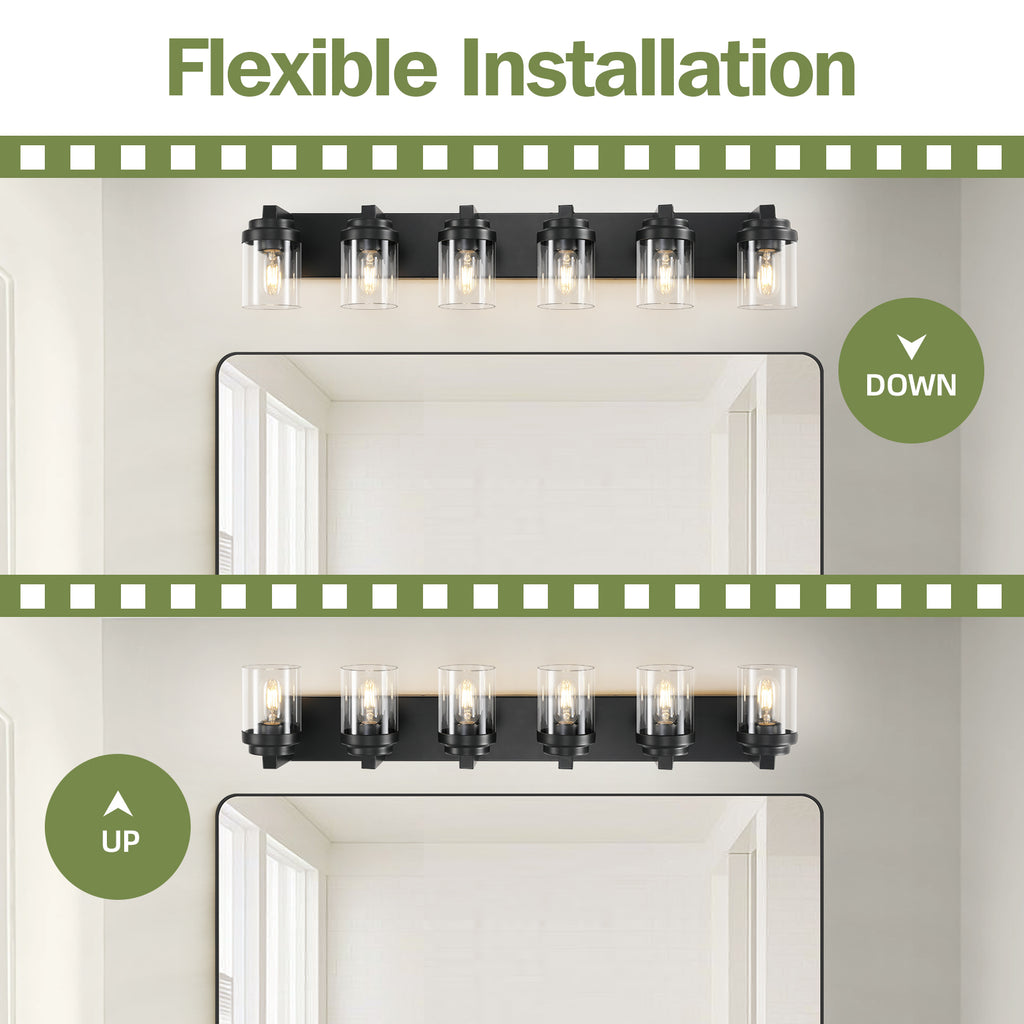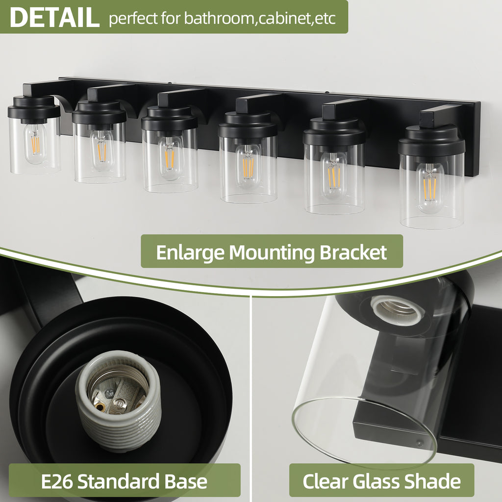 6 Light Black Vanity Lights with Clear Glass Shade, Farmhouse Bathroom Vanity Light