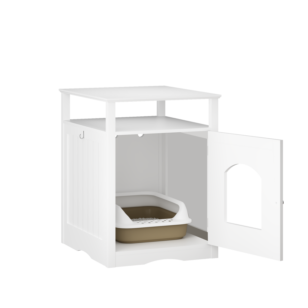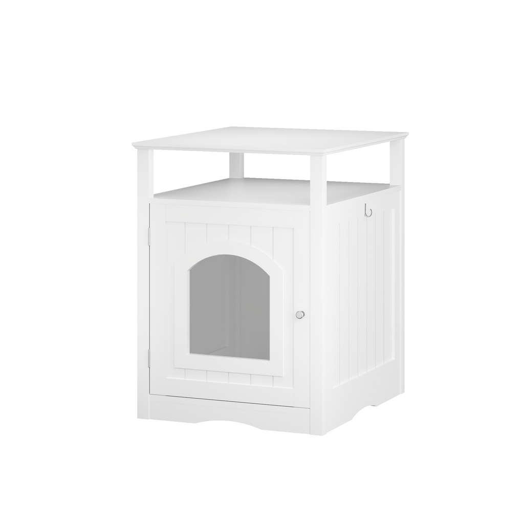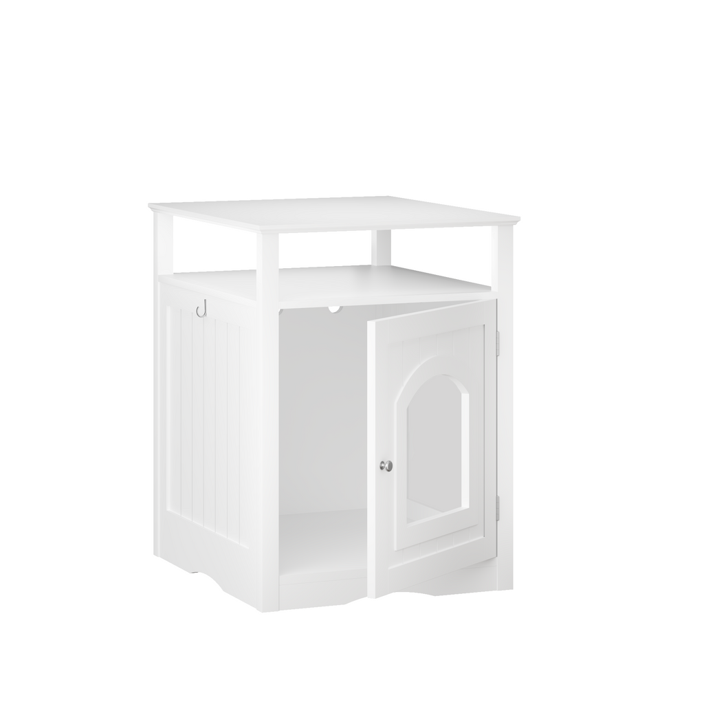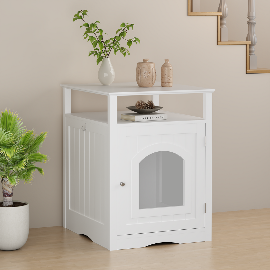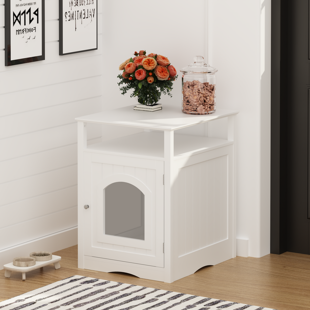 Cat Litter Box Enclosure Furniture, Indoor Wooden Cat House with Enclosed Cabinet, Hidden Litter Box Furniture with Storage Shelf, Modern Cat Condo Side Table for Living Room or Bedroom – White