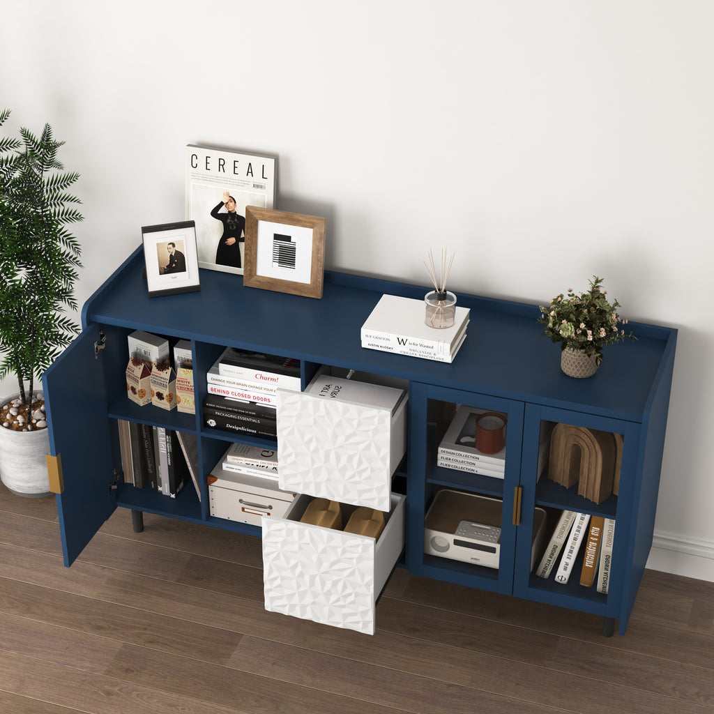 Modern Kitchen Pantry Storage Cabinet , 55' Coffee Bar Storage Cabinet with 2 Drawers, 2 Open Storage Compartment & 2 Glass Doors, Wood Buffet Table for Kitchen, Living Room, Blue