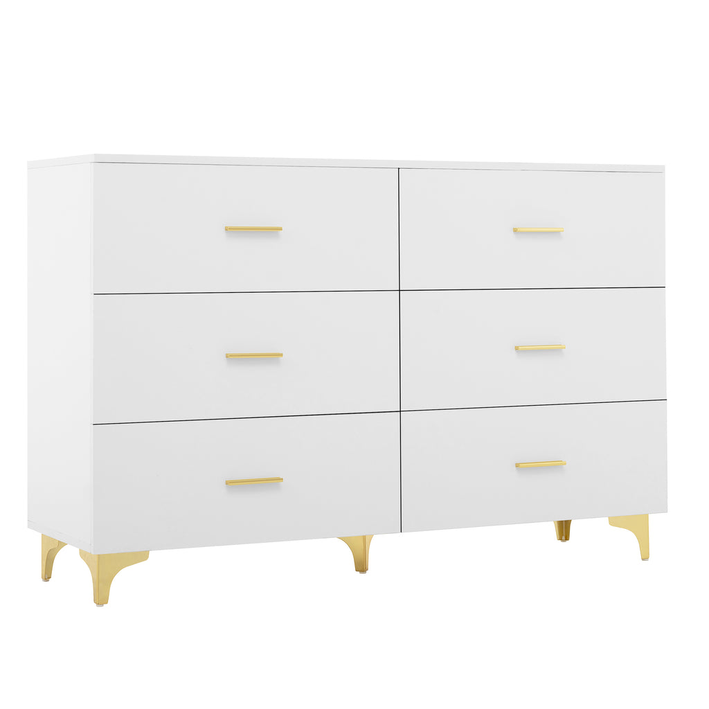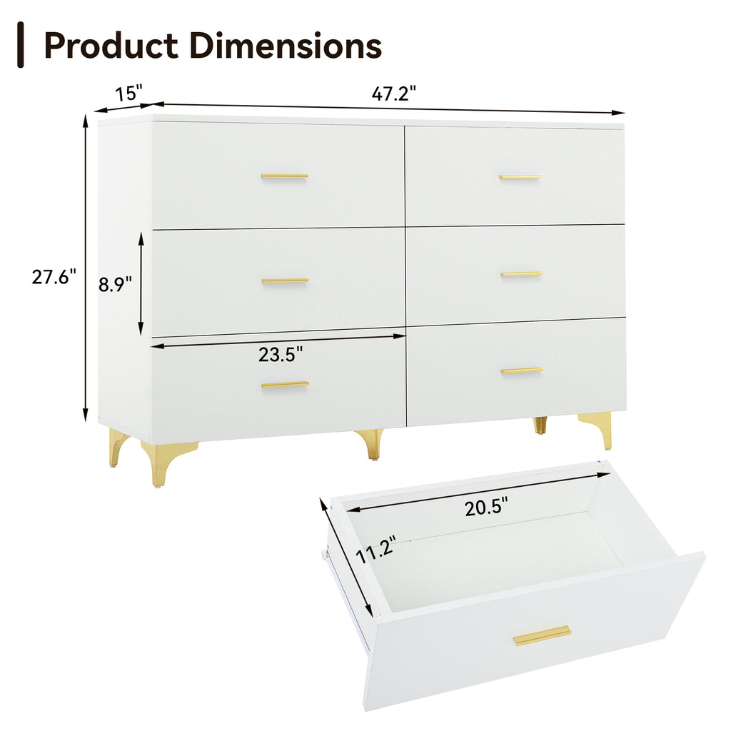 White 6 Drawer Dresser with Gold Handles & Metal Legs, Deep Storage Space, Modern Chest of Drawers, Wooden Dresser Tv Stand for TV Stand,Living Room, Hallway, Entryway