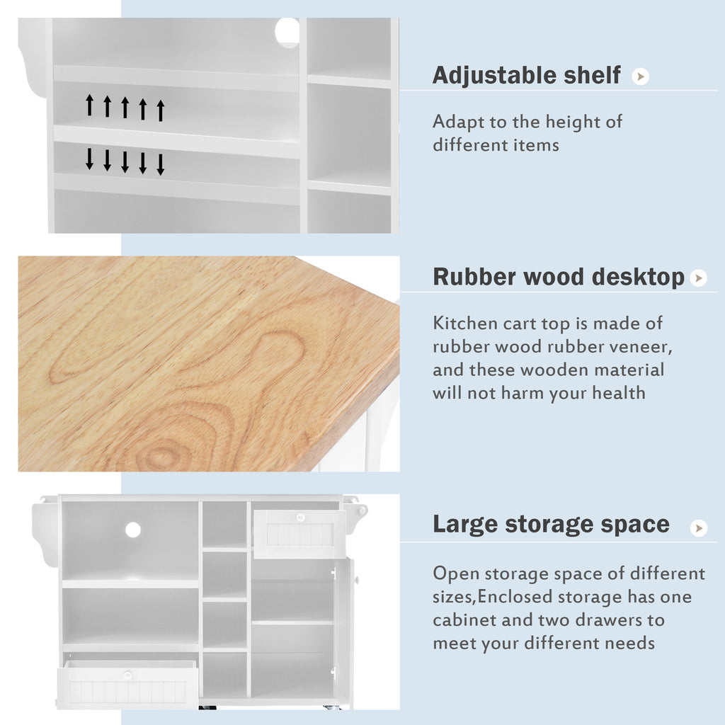 Kitchen island cart features as medium density fiberboard made for its sturdy and durable, which it load capacity up to 220lbs; The tabletop is made of rubber wood, which is smooth, flat, heat-resistant and moisture-proof with veneer technology.
