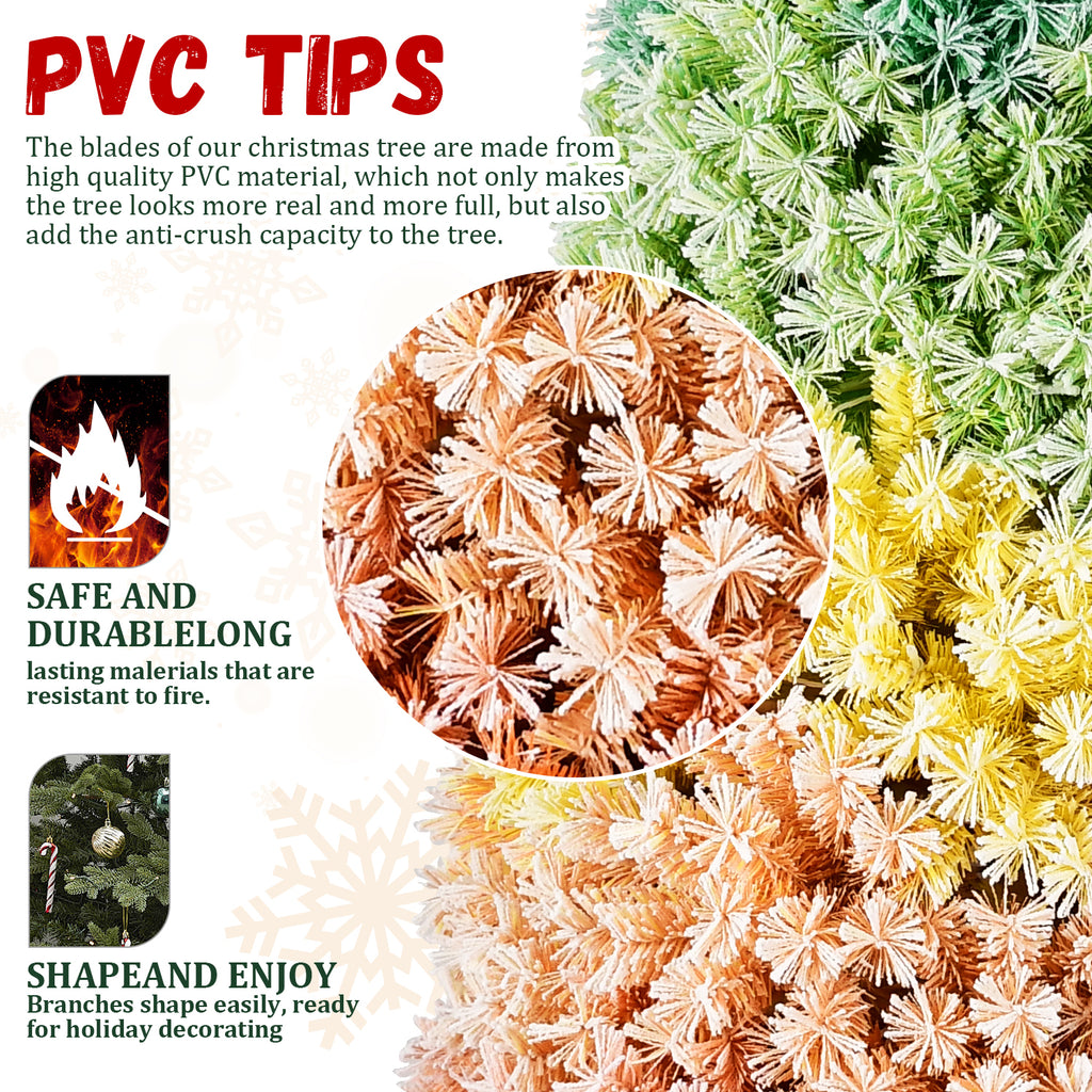 6ft Rainbow Gradient Flocked PVC Christmas Tree with 1326 Tips, Colorful Full-Bodied Artificial Pine with Snowy Finish, Hinged Design and Sturdy Metal Stand for Holiday Decoration