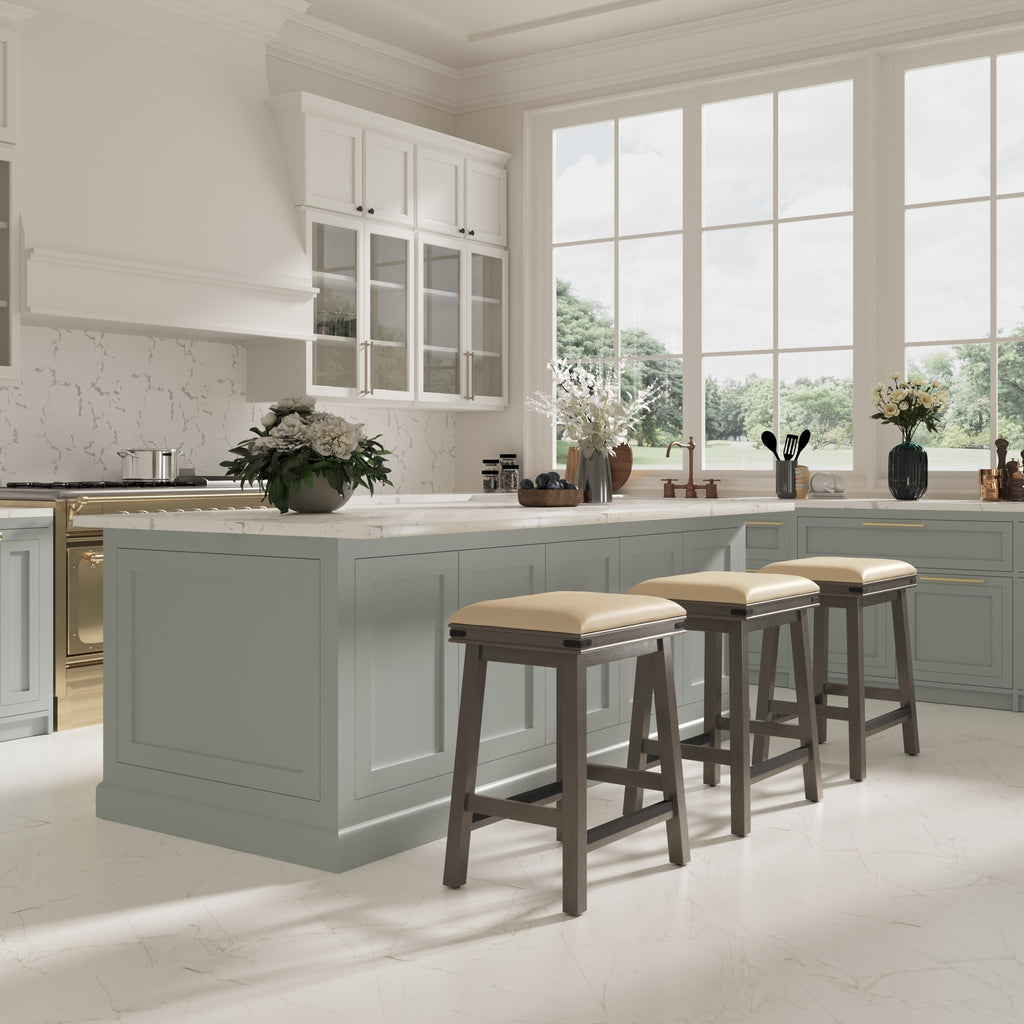 Expertly crafted these contemporary stools are finished in a beautiful espresso, antique white and weather gray finish complemented by a bonded leather cushioned seat and decorative metal accents. Available in 24' counter height or 30' bar height.