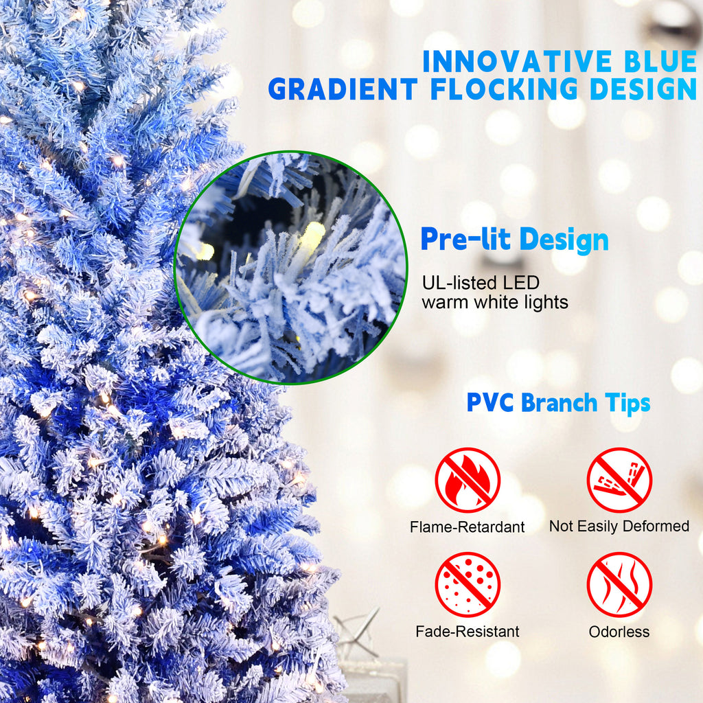 7FT Blue Gradient Flocked Pencil Christmas Tree with 300 Warm White LED Lights, 725 Tips, Hinged Branches, Slim Design, Metal Stand – Narrow Prelit Tree for Holiday Home Decor