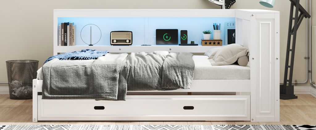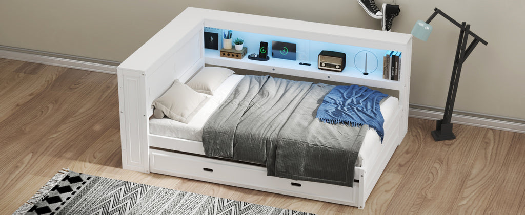 Full Size Wood Daybed with Storage Shelves, USB, LED, and Trundle, White
