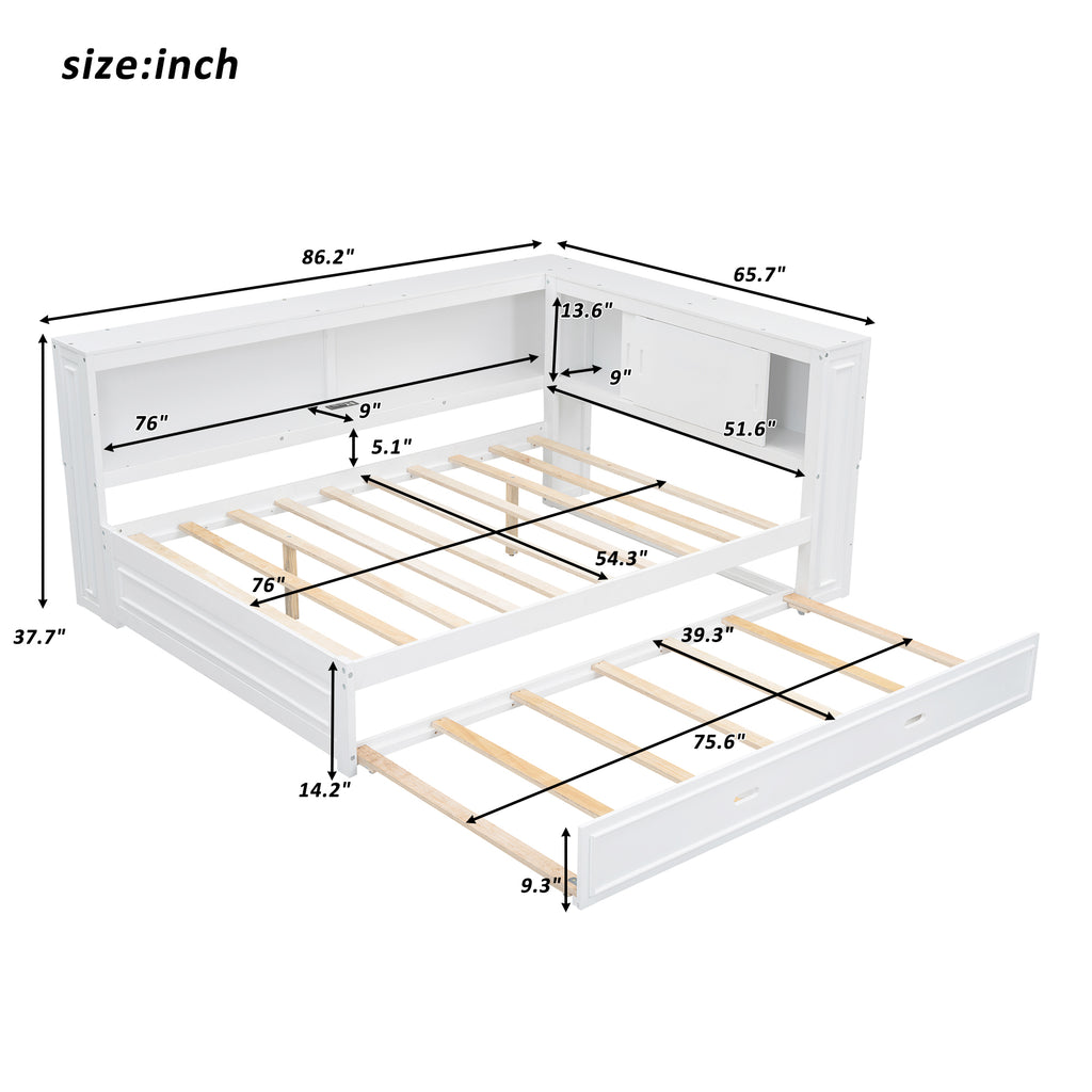 This wood daybed with trundle and storage shelves is the perfect charming piece for every home. White or antique wood color finish design will bring more possibilities to your home decoration. Besides, shelves provide ample storage space to keep your room neat and simple. LED, USB Ports make it more practical and convenient. Constructed of solid pine wood+MDF, this daybed features a sturdy high quality solid wood construction for durability and high load capacity, ensuring longevity.