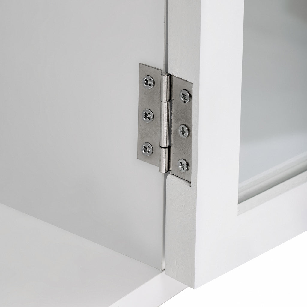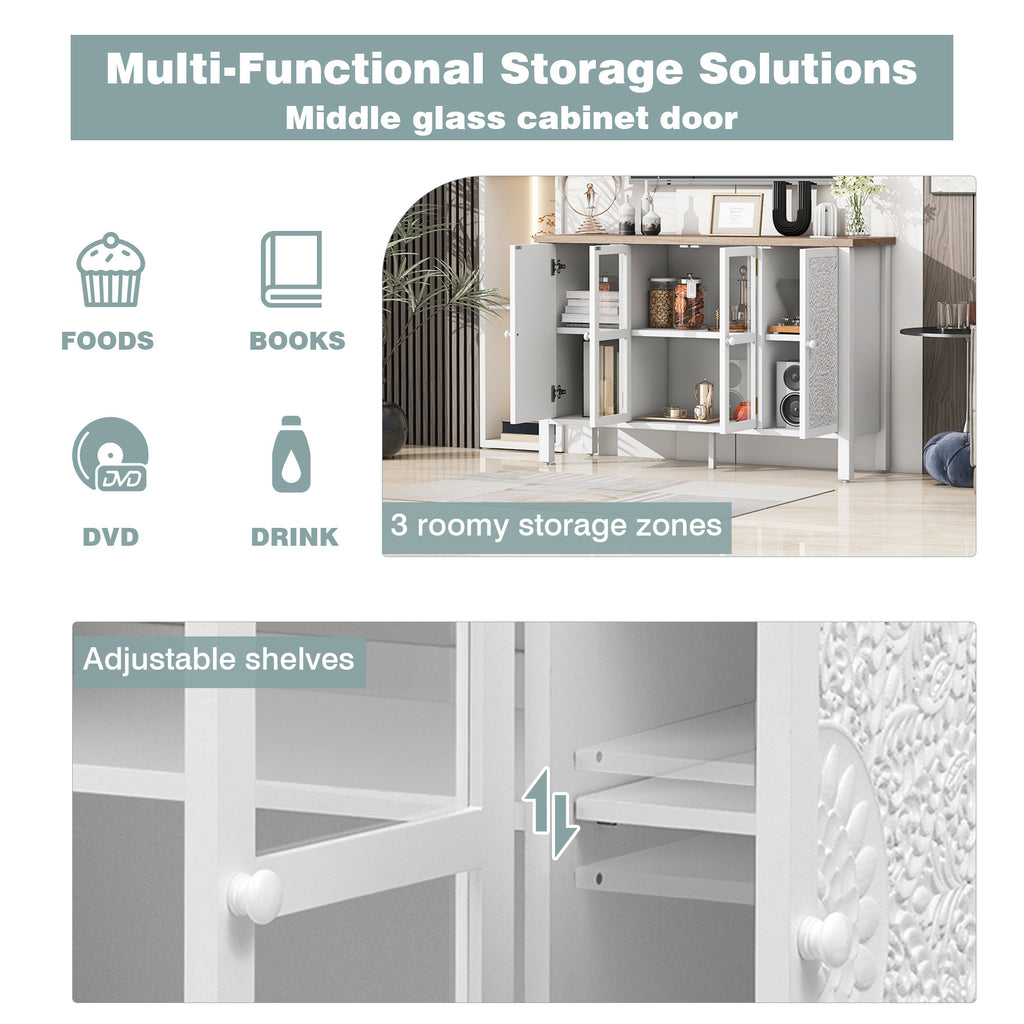 • Including three spacious cabinets, the middle cabinet features a glass door that clearly displays the items inside, making it easy for you to quickly find what you need. It also adds a touch of transparency and an artistic atmosphere to the entire home environment. The cabinet doors on both sides are symmetrically carved with patterns, and each cabinet contains an adjustable shelf that can be moved up and down according to your personal requirements.