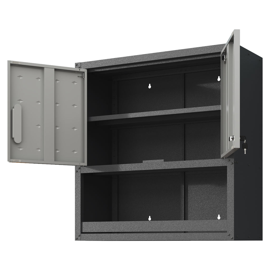 • Product Description::Introducing the Metal Wall Storage Cabinet, a locking door and open drawer solution for organized spaces. This Wall-Mounted Storage Cabinet is designed for durability and convenience, perfect for garages, warehouses, and offices. With a sleek Gray finish and a size of 29.5'W x 30.3'H x 11.8'D, it offers a high-capacity storage option that's easy to assemble.