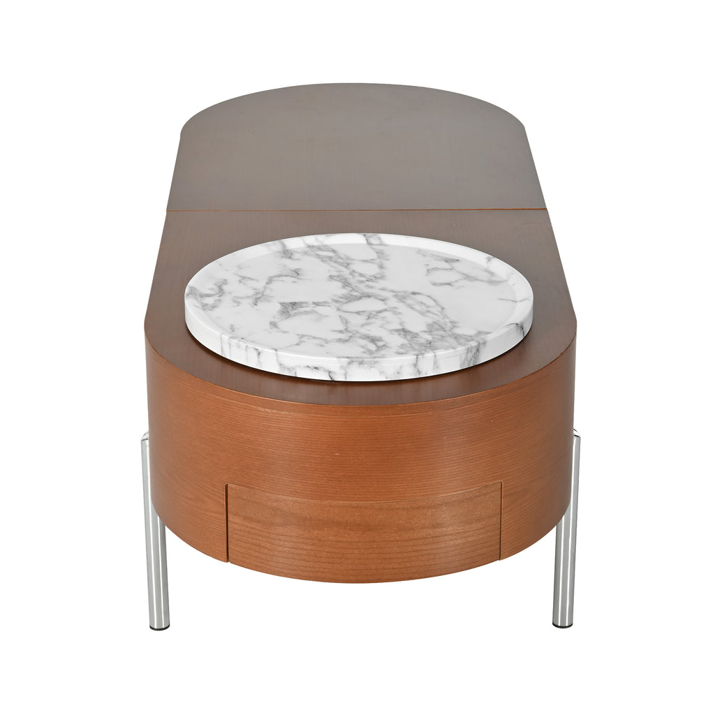 - 5 hidden storage options--2 hidden compartments beneath the lift-up surface and 360-degree rotating tray, perfect for storing books, magazines, remote controls, or other items that you don’t need to have visible at all times. Three drawers can be used to store items like stationery, extra cables, or other small household objects.
