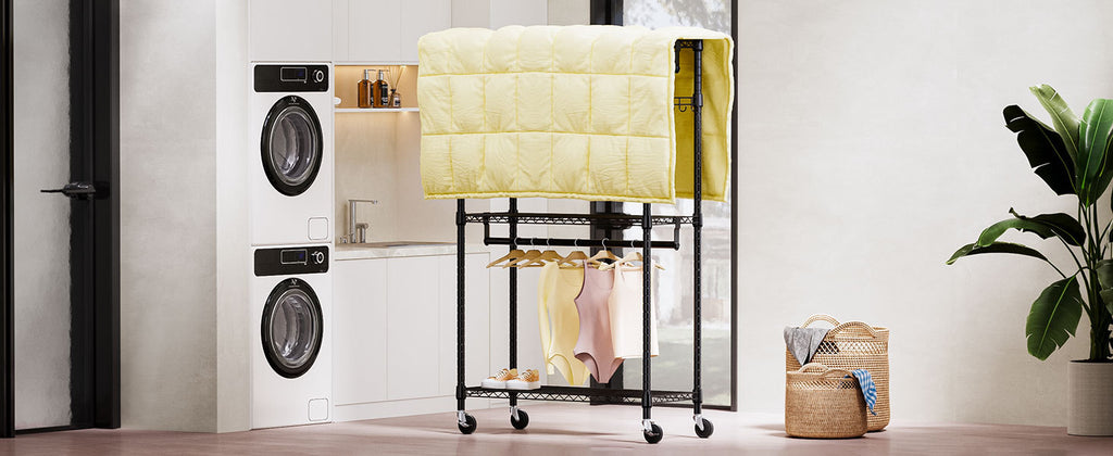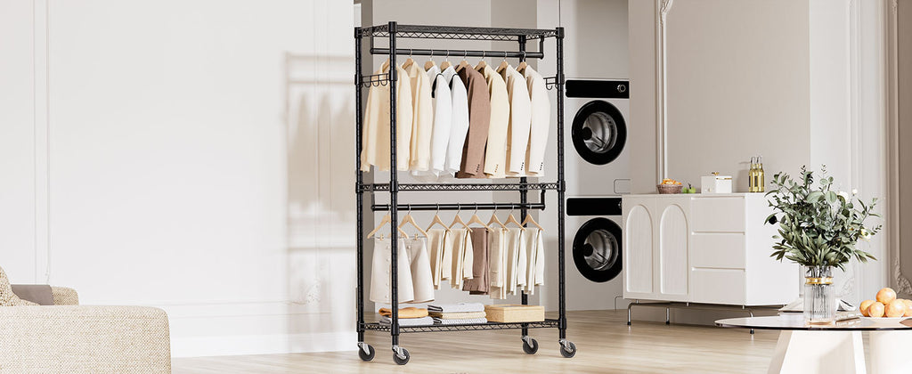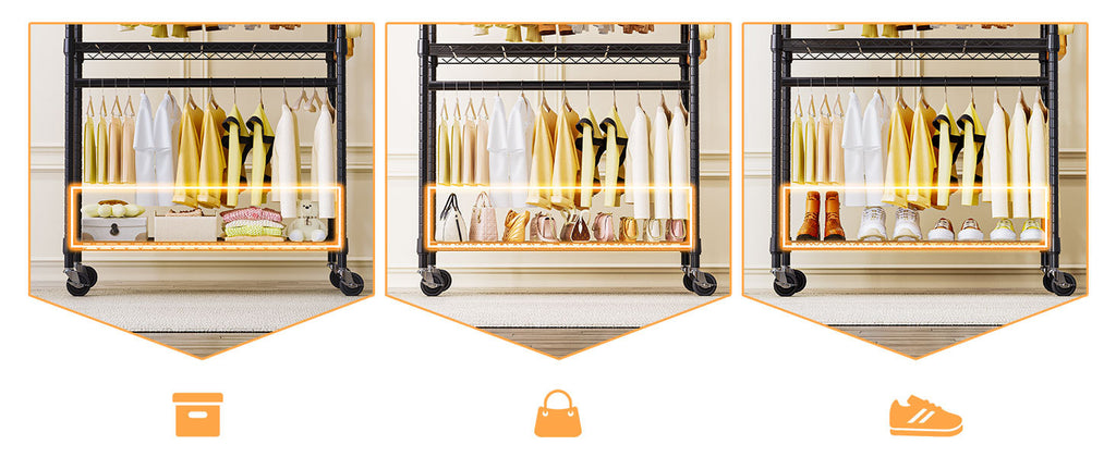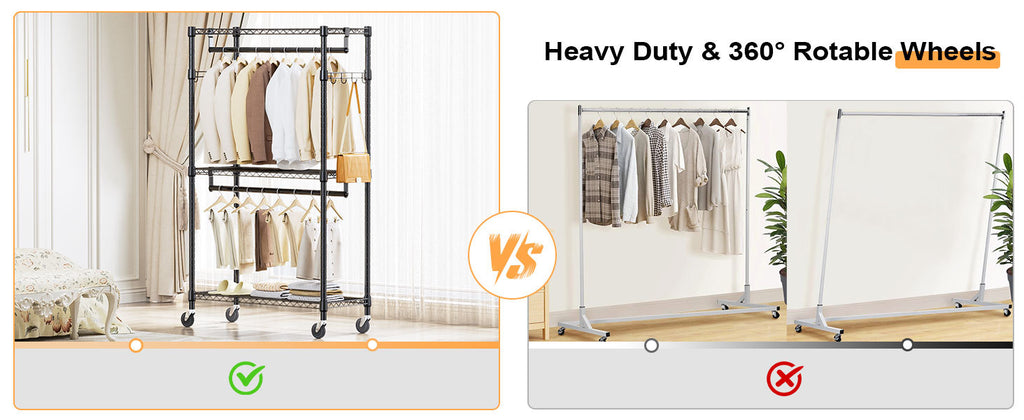 • Lockable 360° Wheels And Multifunctional: This rolling clothes rack has 4 heavy-duty rolling wheels, and thus you can easily move anywhere you need, such as the entry closet, laundry room, hallway, balcony, bedroom, cloakroom, bathroom, garage, and more. And 2 of them are lockable, which ensures more safety.