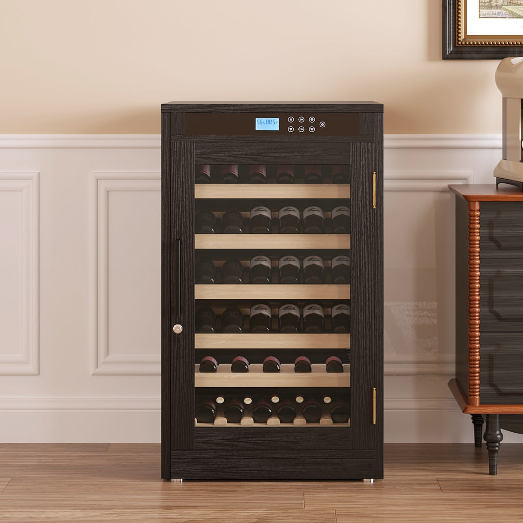 • The black wood exterior of this wine cooler cabinet exudes sophistication and luxury. It complements any home decor style, from modern to traditional, and adds a touch of elegance to your wine storage solution. The sleek design of the cabinet makes it a focal point in any room, drawing attention to your impressive wine collection.