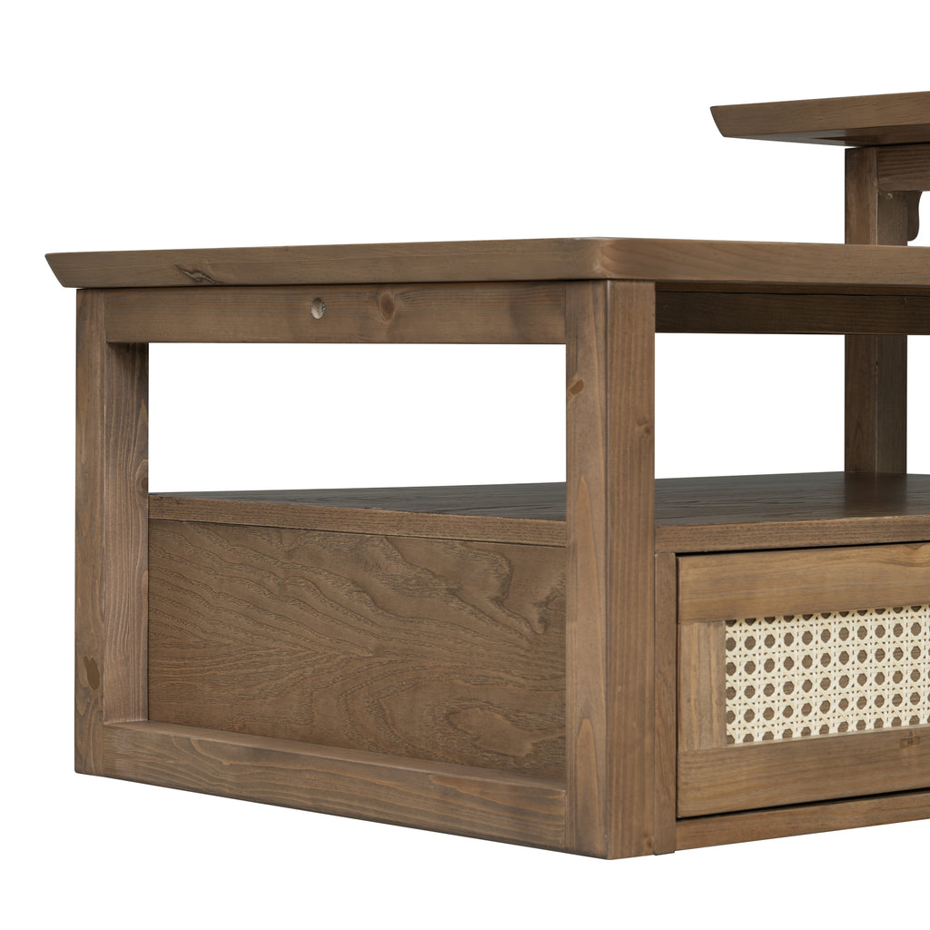 • This coffee table harmoniously fuses practicality and aesthetics, featuring a meticulously woven drawer crafted from durable rattan that provides enchanting storage for small items while adding rural charm and functionality, a sleek shelf, and dual spacious, practical tabletops that effortlessly accommodate tableware, laptops, and daily essentials, all enhancing any living space with its unpretentious elegance and impeccable practicality.
