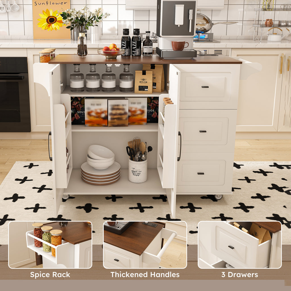 White Kitchen Island Cart with Foldable Tabletop & Drop Leaf - Mobile Breakfast Bar with Wood Top and Storage