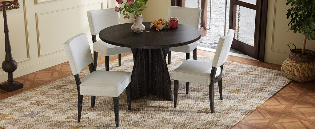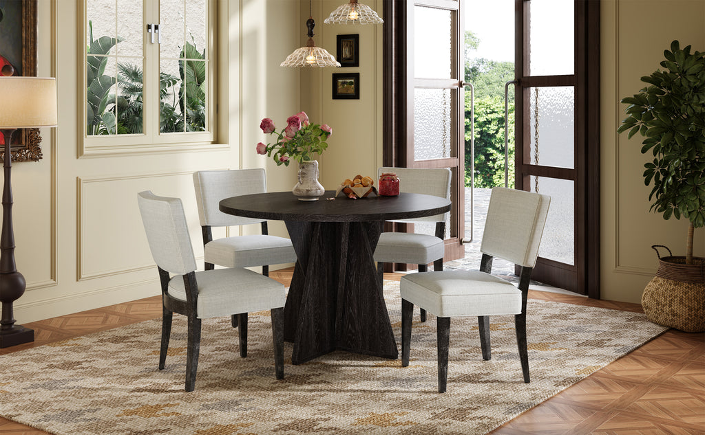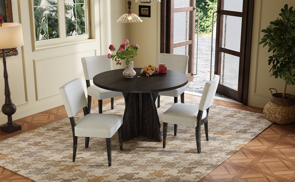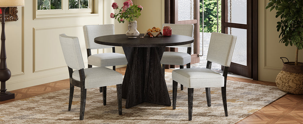 Upgrade your dining space with this round dining table set for 4, featuring a round dining table and 4 upholstered chairs. The wood finish with a distressed touch adds a warm, inviting feel, perfect for farmhouse and retro interiors. The compact round shape makes it ideal for small dining areas and cozy kitchens. It’s available in two colors, Natural Wood Wash and Espresso. No matter which color dining set you choose, it will be an ideal centerpiece for any dining space.