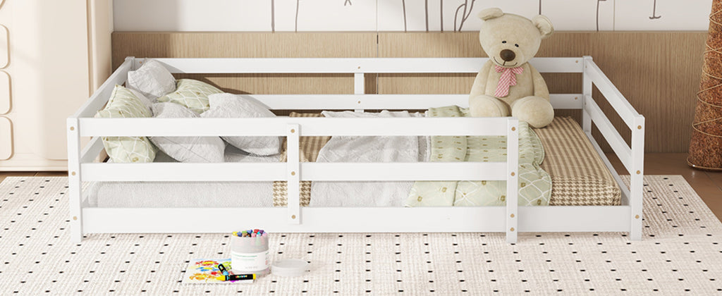 Full Size Floor Bed, Montessori Floor Bed with Fence, Kids Montessori Bed Full Size, Wood Montessori Floor Bed for Kids, Girls, Boys, White.