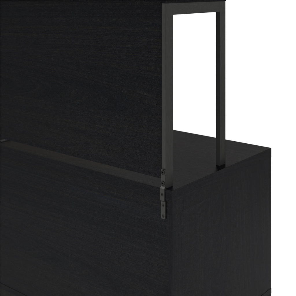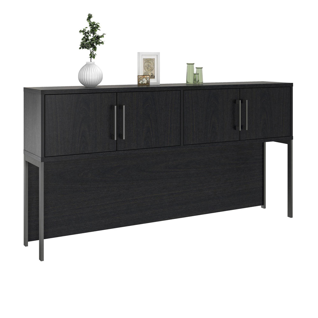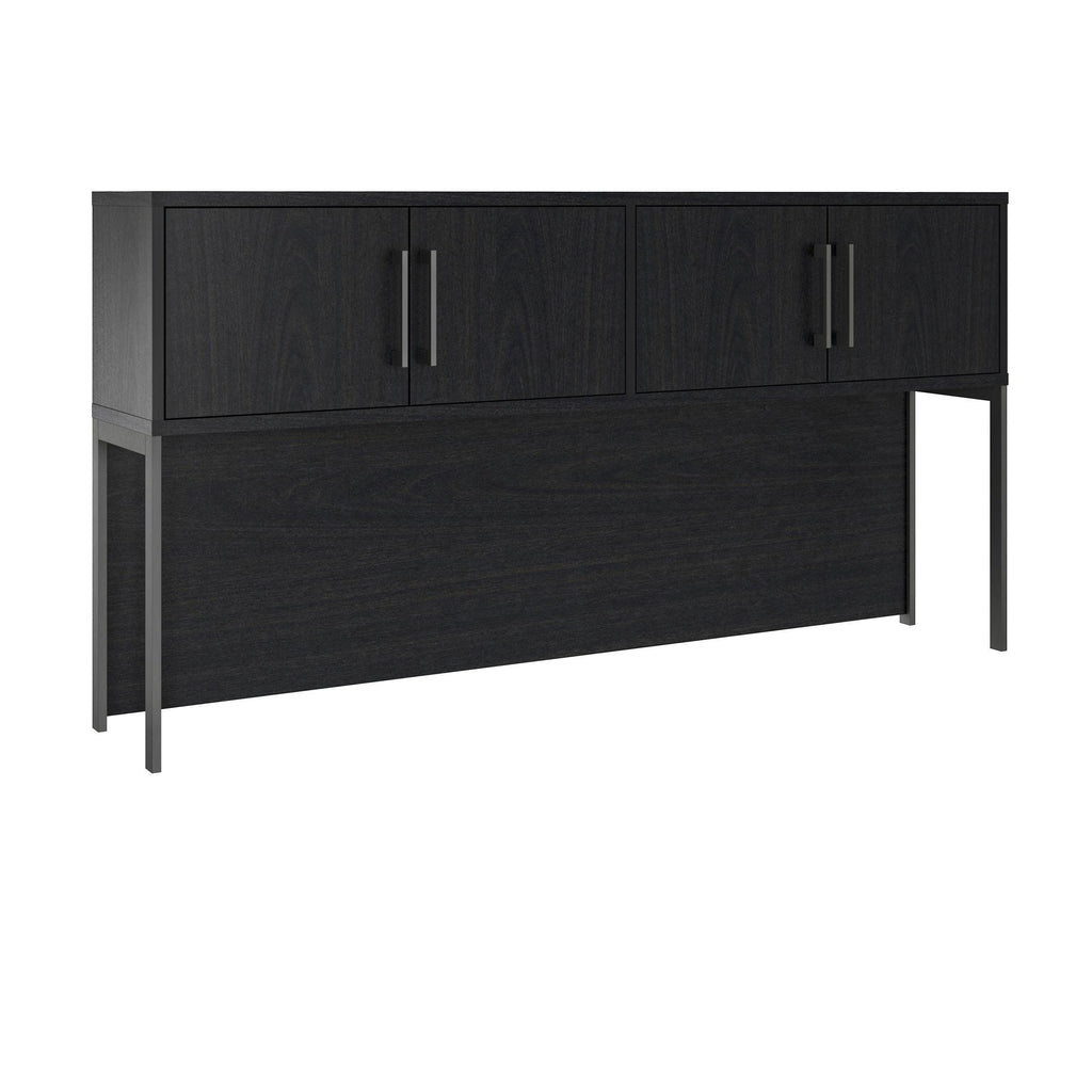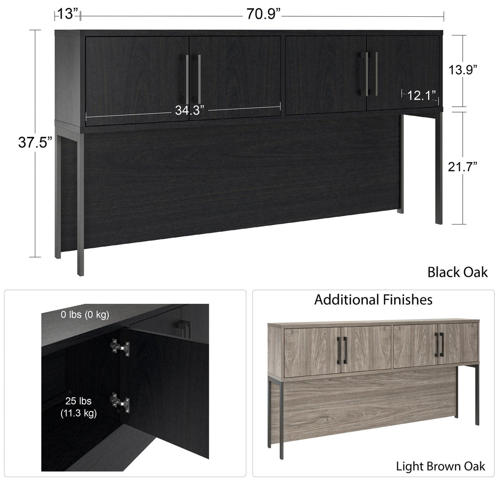 Add extra storage to your office with the Parkside Hutch. This Hutch creates valuable concealed storage without taking up more floor space. The 4 doors hide 2 storage cubbies to storage away extra office supplies, paper, and books. The durable metal frame and melamine are easy to clean with a damp cloth and features a black oak finish to add an updated, modern feel to your space. The Hutch has been tested to meet ANSI-BIFMA standards for commercial use. A wall anchor kit is included to secure the Hutch to the wall and prevent tipping injuries. The Hutch ships flat to your door and requires assembly upon opening. Two adults are recommended to assemble. Once assembled, the Hutch measures to be 37.5'H x 70.875'W x 13'D.
