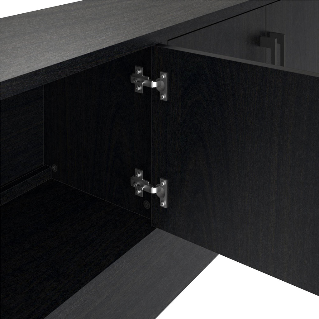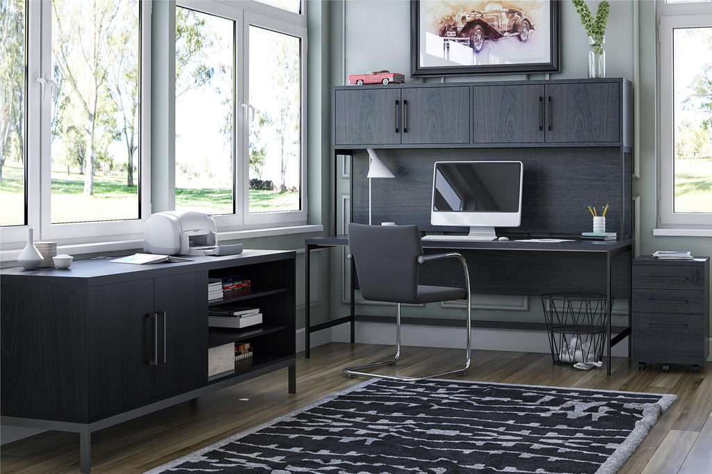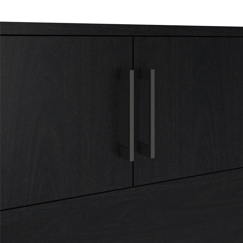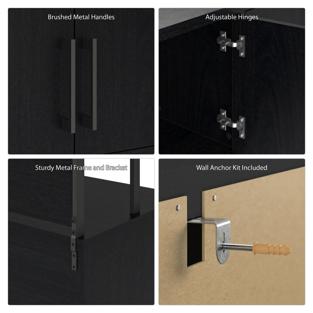 Add extra storage to your office with the Parkside Hutch. This Hutch creates valuable concealed storage without taking up more floor space. The 4 doors hide 2 storage cubbies to storage away extra office supplies, paper, and books. The durable metal frame and melamine are easy to clean with a damp cloth and features a black oak finish to add an updated, modern feel to your space. The Hutch has been tested to meet ANSI-BIFMA standards for commercial use. A wall anchor kit is included to secure the Hutch to the wall and prevent tipping injuries. The Hutch ships flat to your door and requires assembly upon opening. Two adults are recommended to assemble. Once assembled, the Hutch measures to be 37.5'H x 70.875'W x 13'D.
