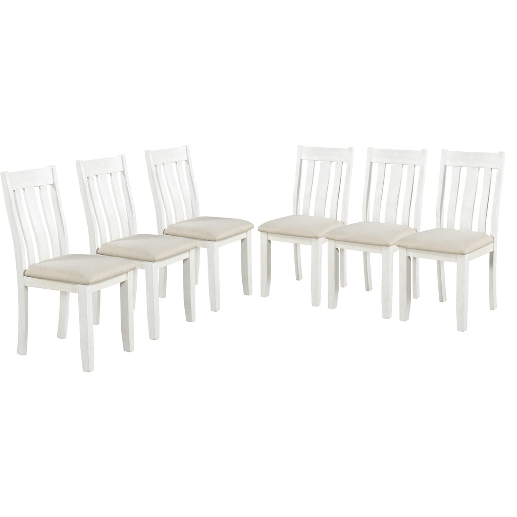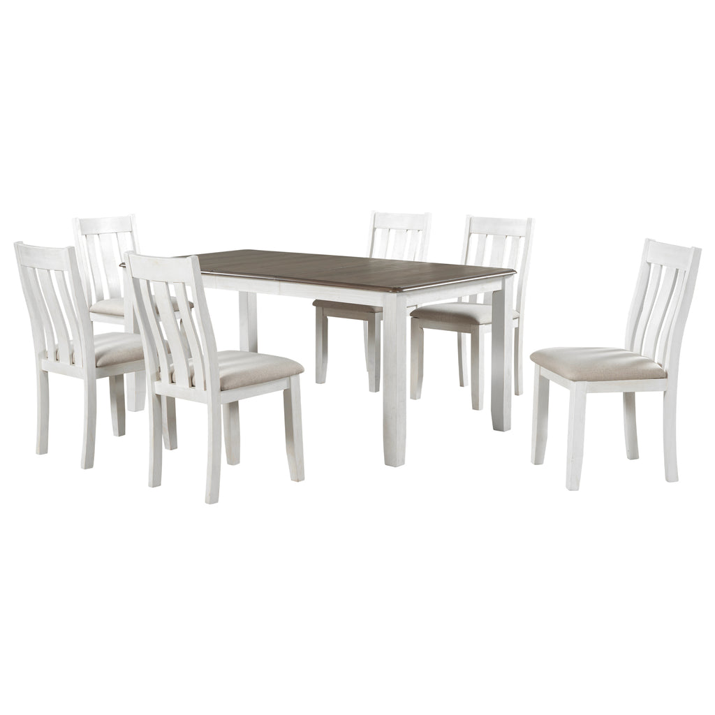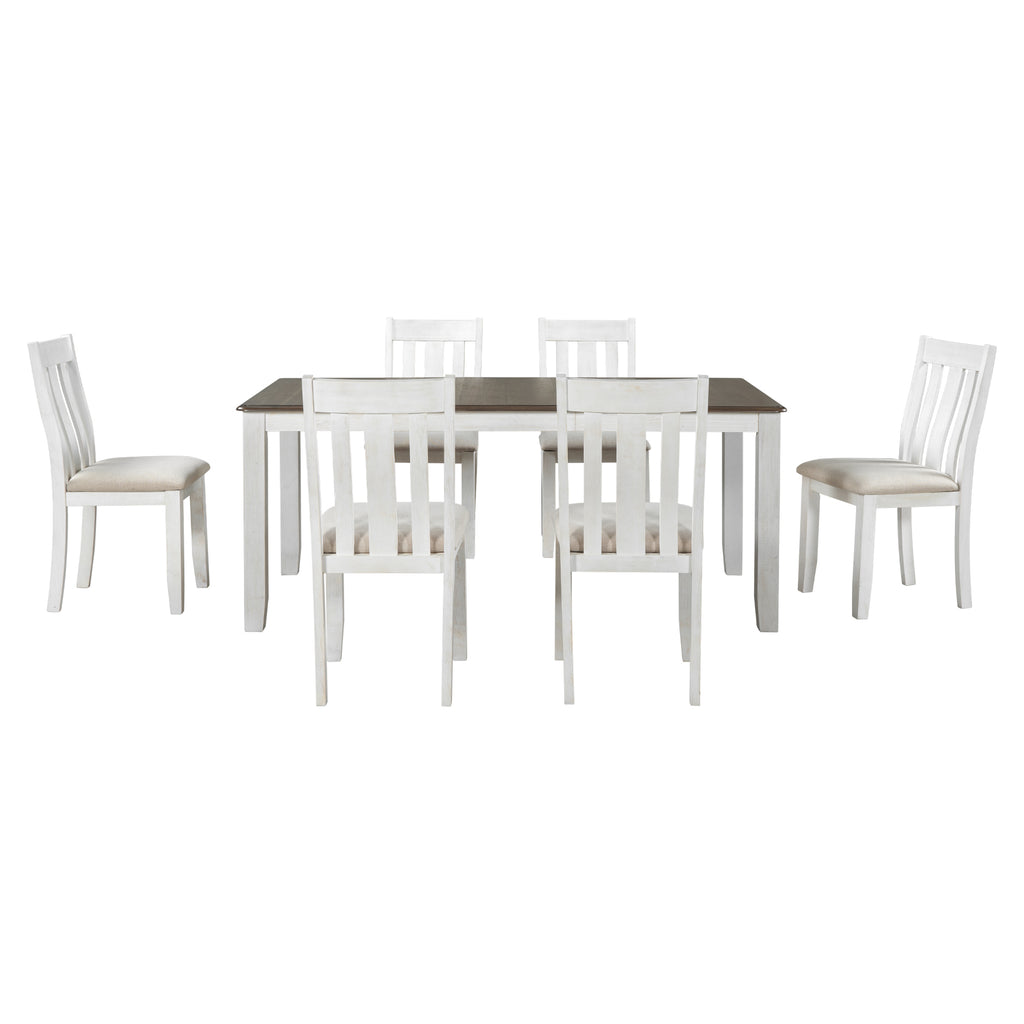 - This 7-piece dining table set is made of rubber wood table legs, pine apron, rubber wood sliding crossbar and MDF table top, which guarantees your service life and daily use. All chair legs, frame are made of rubber wood, with linen upholstered filled with high-density foam. Thereby ensuring the comfort. Table weight capacity: 350 LBS, chair weight capacity 250 LBS/piece.