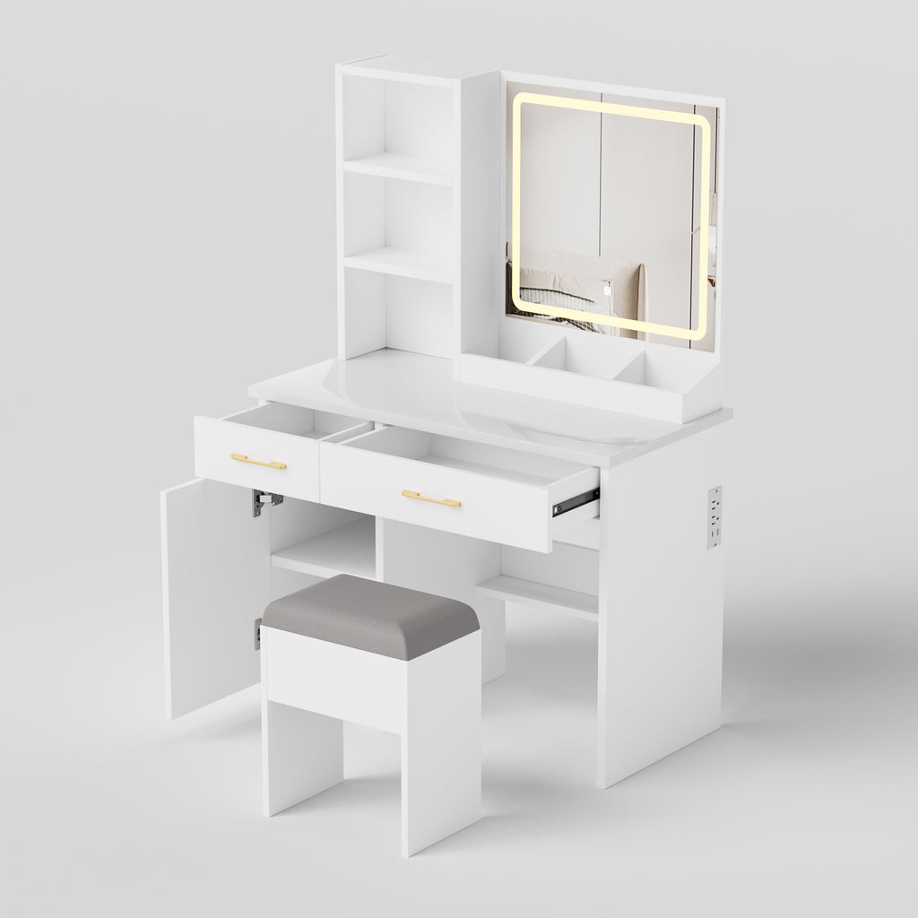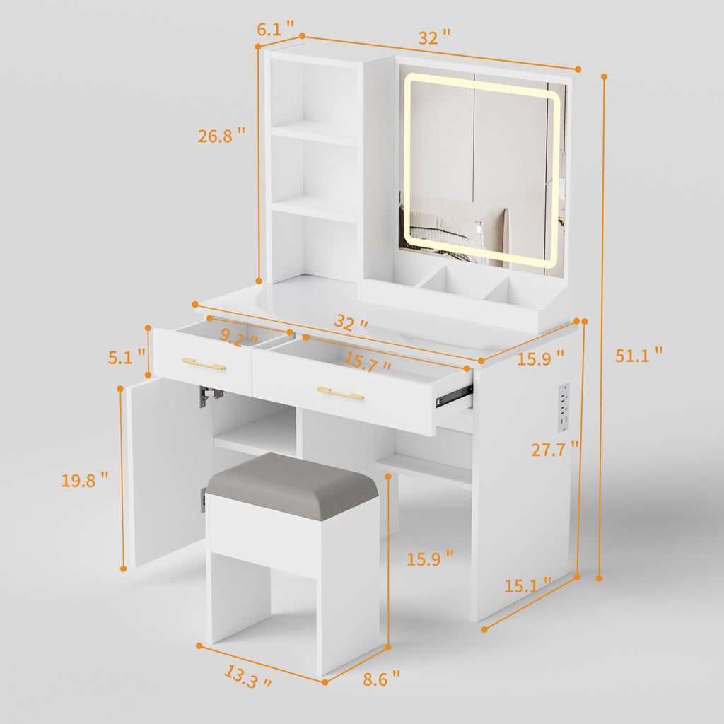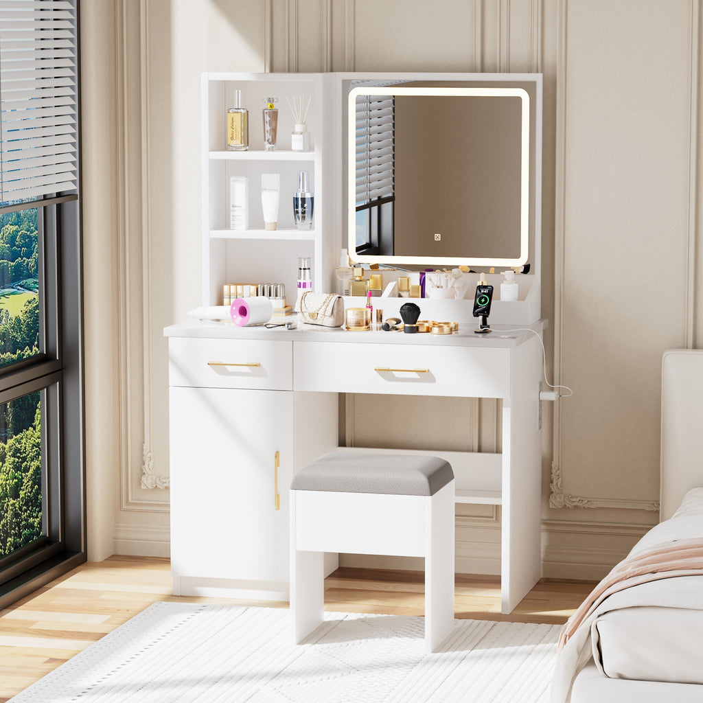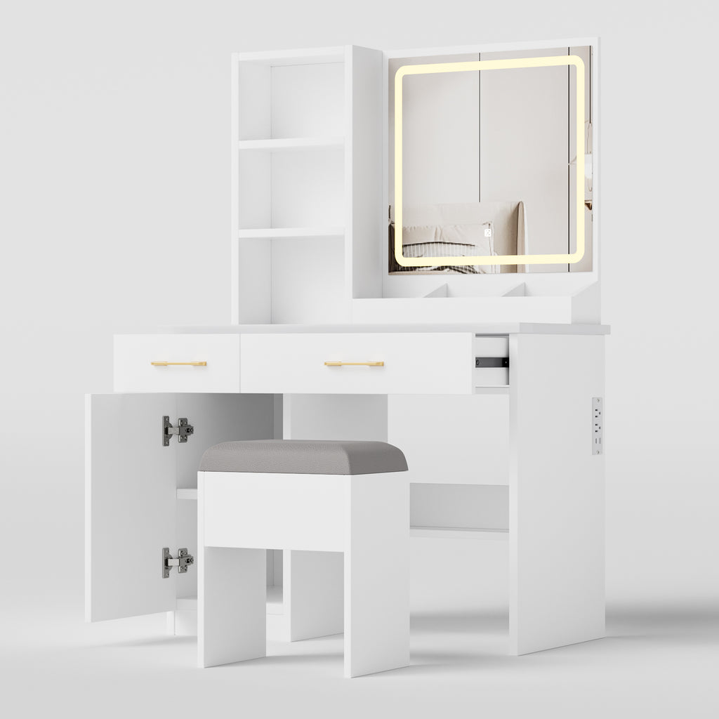 Makeup Vanity Desk with Mirror and Lights, White Vanity Table with Power Outlet and 3 Lighting Modes, Dressing Table Set with Cabinet Drawers Shelves and Storage Stool for Bedroom