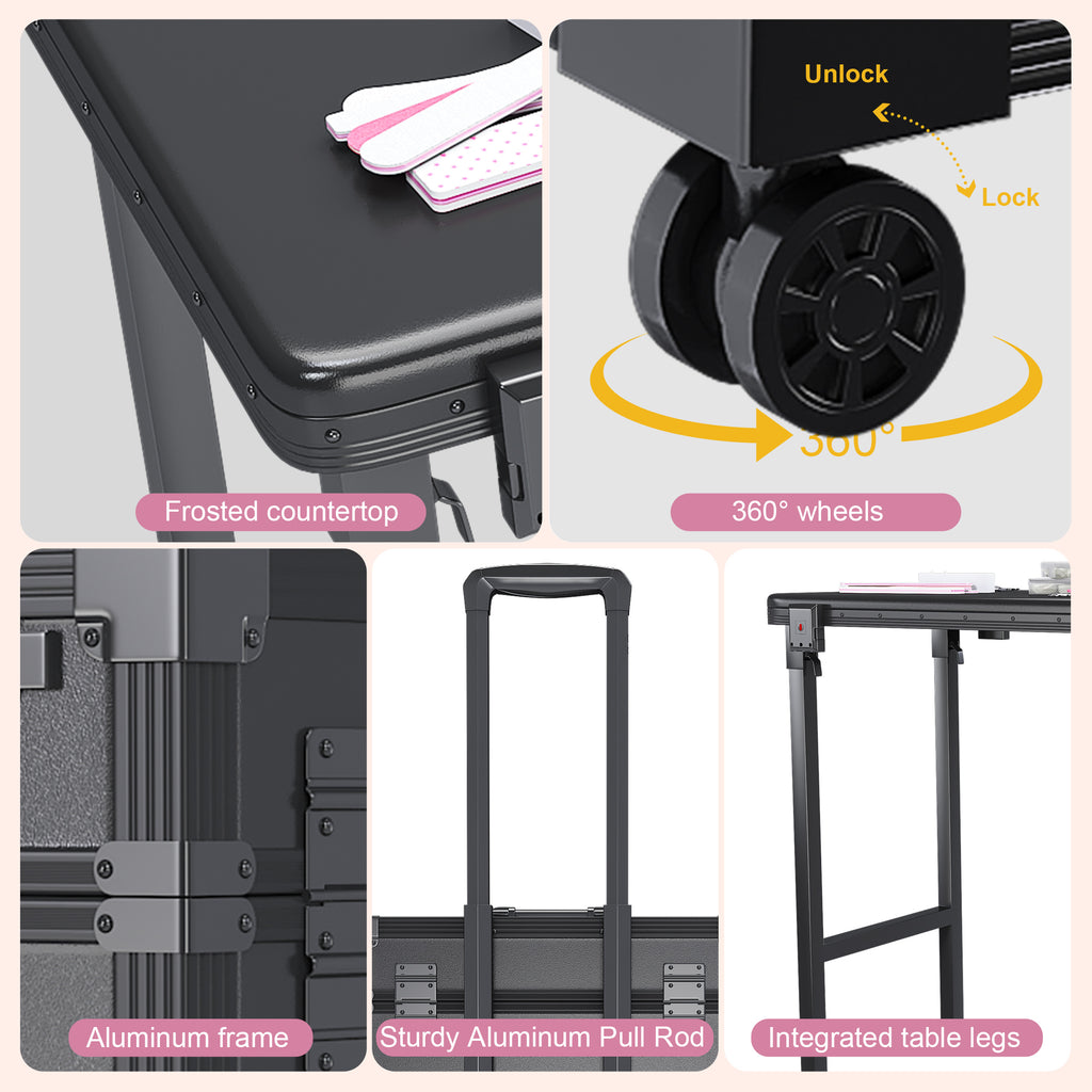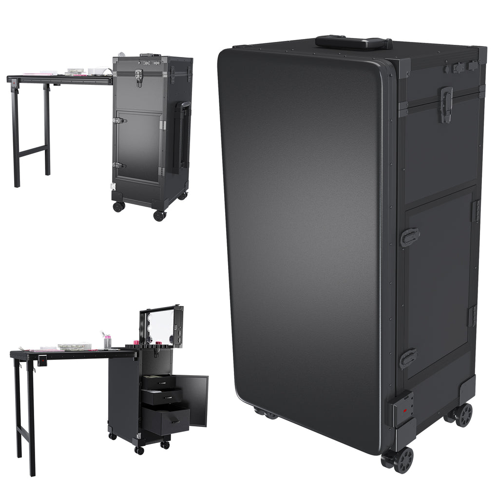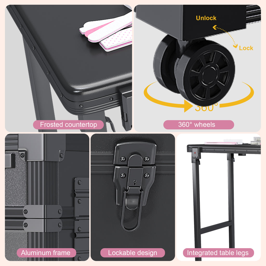 • ALL-IN-1 SALON SOLUTION – Combines a professional worktable, giant cosmetic organizer (makeup, brushes, etc.), and mobile convenience—built to last for pros and passionate DIYers.