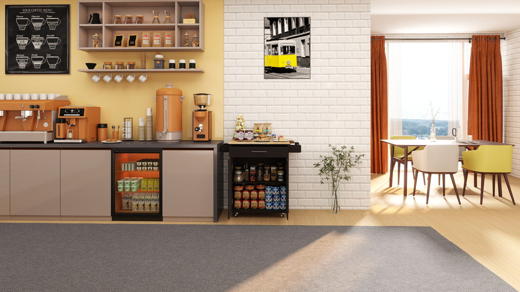 • Extra towel and seasoning space: There are towel rack and seasoning rack on both sides of this black kitchen island. You can easily pick up kitchen towels or seasonings, and when you move the cart, it can also be used as a handle.