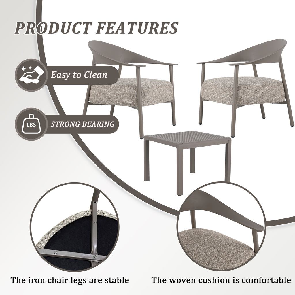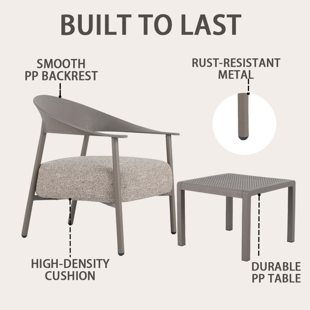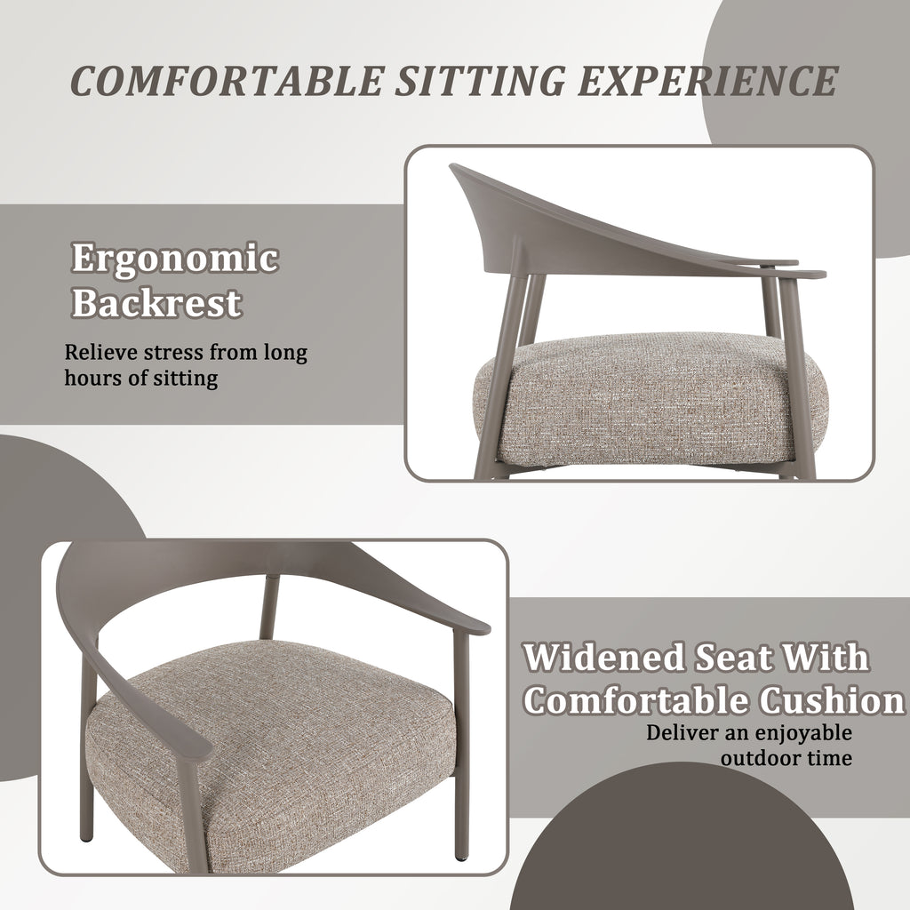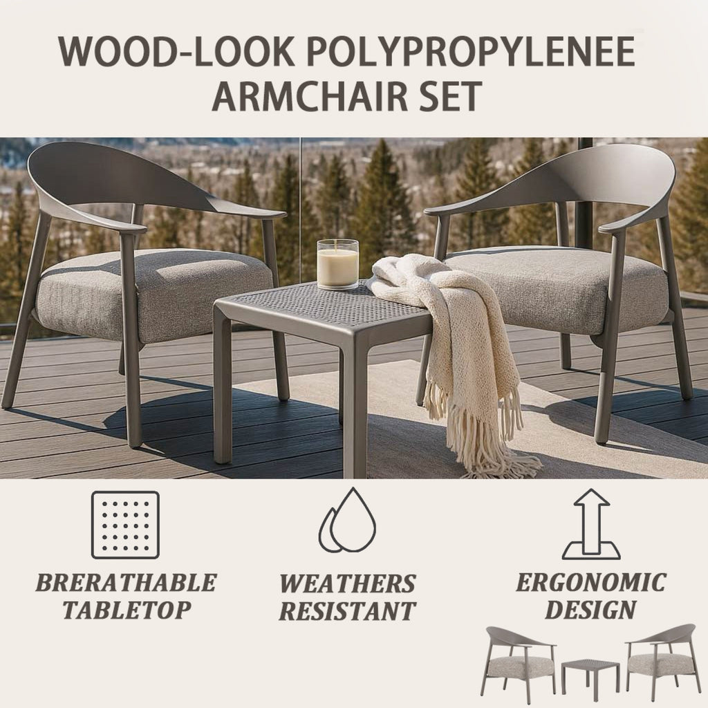 Furniture Set with Seat Cushions, Sturdy and Durable, in Warm Grey. Dimensions: 29.13*25*29.53 (in)/19.69*19.69*14.96 (in). Chair Body made of Plywood, Powder-coated Metal Legs, and PP Table.