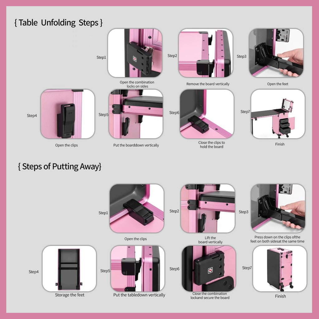 • ALL-IN-1 SALON SOLUTION – Combines a professional worktable, giant cosmetic organizer (makeup, brushes, etc.), and mobile convenience—built to last for pros and passionate DIYers.