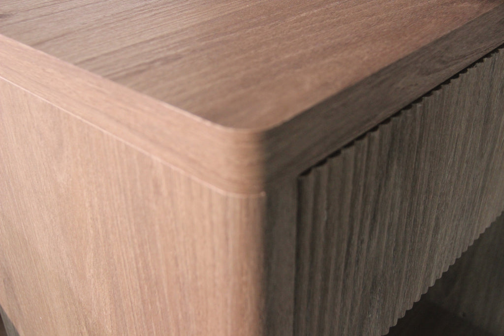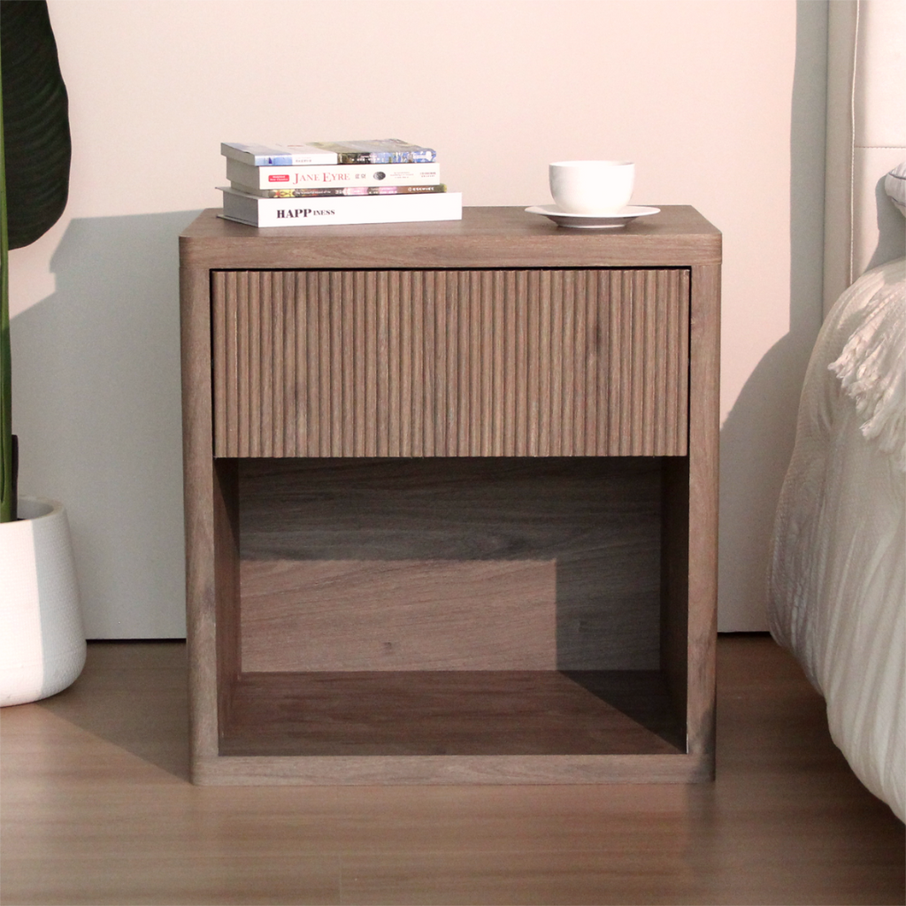 - Our bed side table boasts a minimalist curve profile and a drawer with a unique waveform panel, perfectly balancing modern aesthetics with functional design. The chic appearance complements various bedroom styles, from contemporary to mid-century modern. The smooth lines and rounded corners make it safe for kids and families, creating a standout piece that elevates the ambiance of your room.