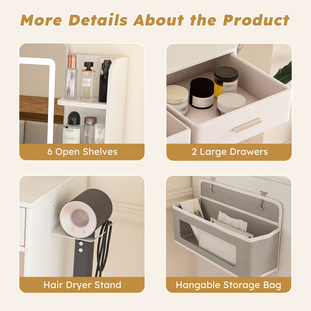 • Embrace Organized Beauty:This vanity features a thoughtful storage system. Two spacious drawers safely store your precious cosmetics collection, six open shelves keep daily tools within easy reach, and the generous 27.56* 15.76-inch desktop provides ample space for products. The included non-woven storage bag offers versatile organization for brushes, jewelry or travel essentials, while the non-slip hair dryer holder ensures styling tools are always accessible. Every design element - from the s