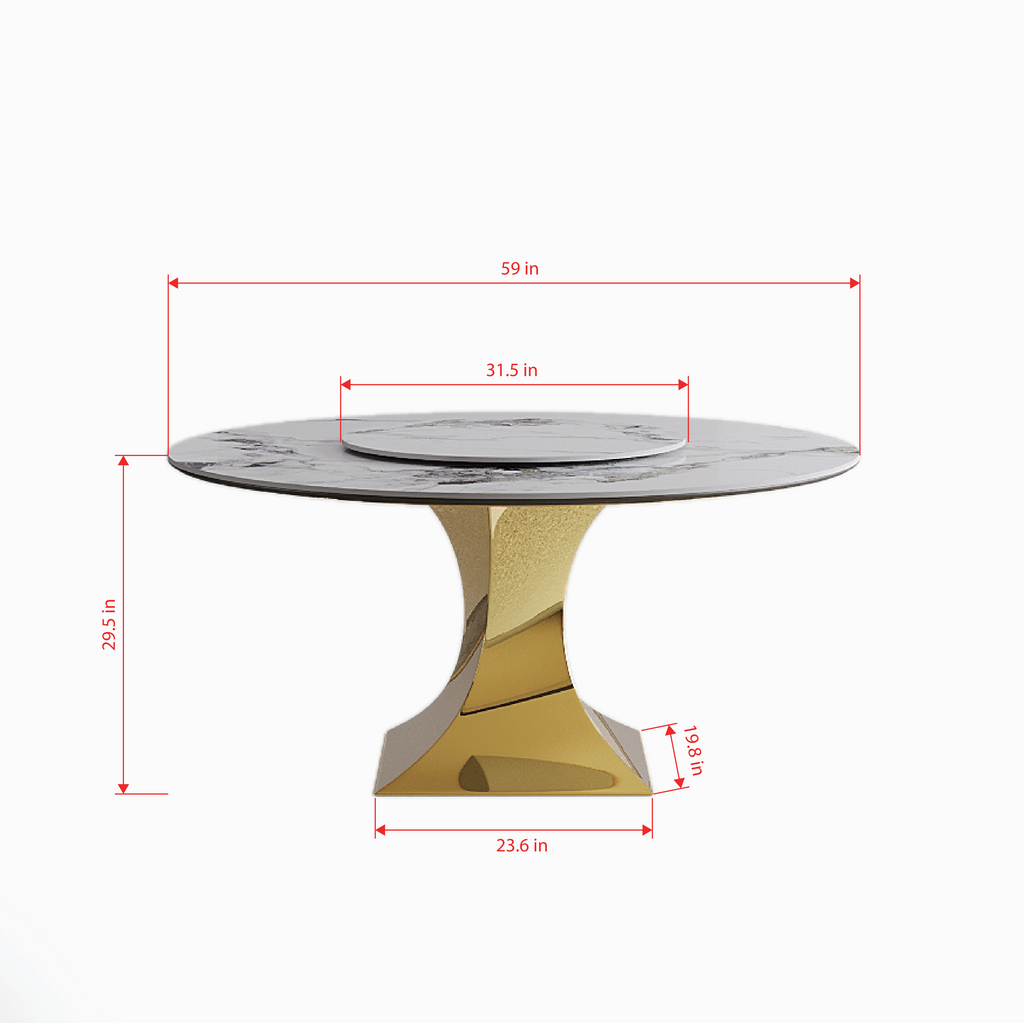 Luxury Round 59' Sintered Stone Dining Table with Gold Stainless Steel Hourglass Base, Scratch & Heat Resistant Surface