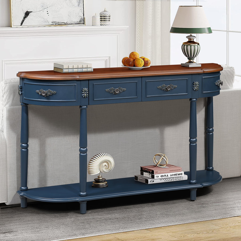 Retro Curved Wood Console Table, 52 inch Circular Half Moon Sofa Table with Open Shelf and 2 Drawers, Solid Wood Entry Table for Living Room, Hallway, Navy Blue + Brown Top