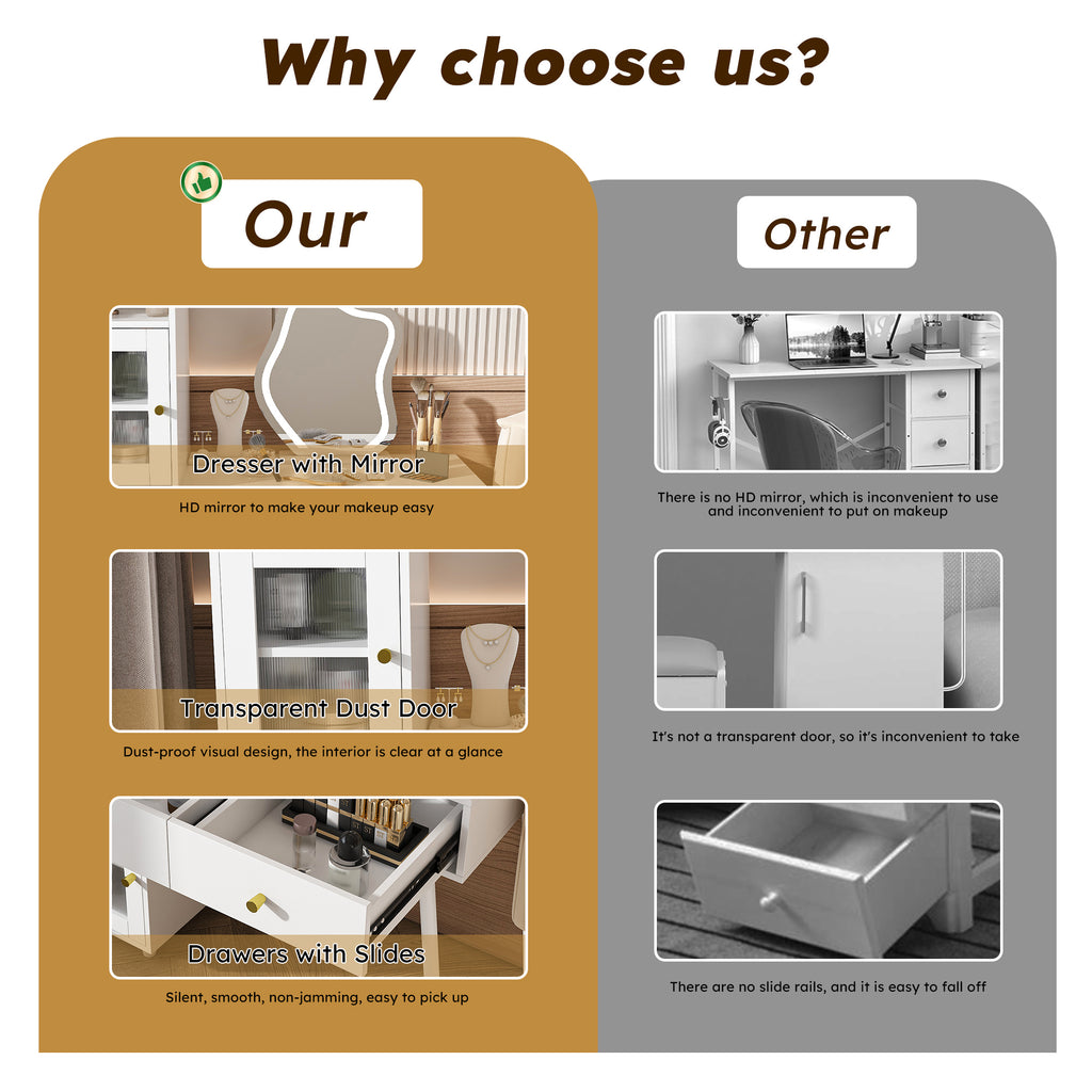 • Spacious & Organized Vanity: Measuring 39.3'L x 15.75'W x 48.82'H, this dressing table delivers massive storage with 3 drawers, 2 open shelves, and 4 hidden cabinets (with transparent doors). Perfectly organizes cosmetics, haircare tools, and jewelry—finally banishing countertop clutter while keeping essentials within easy reach.